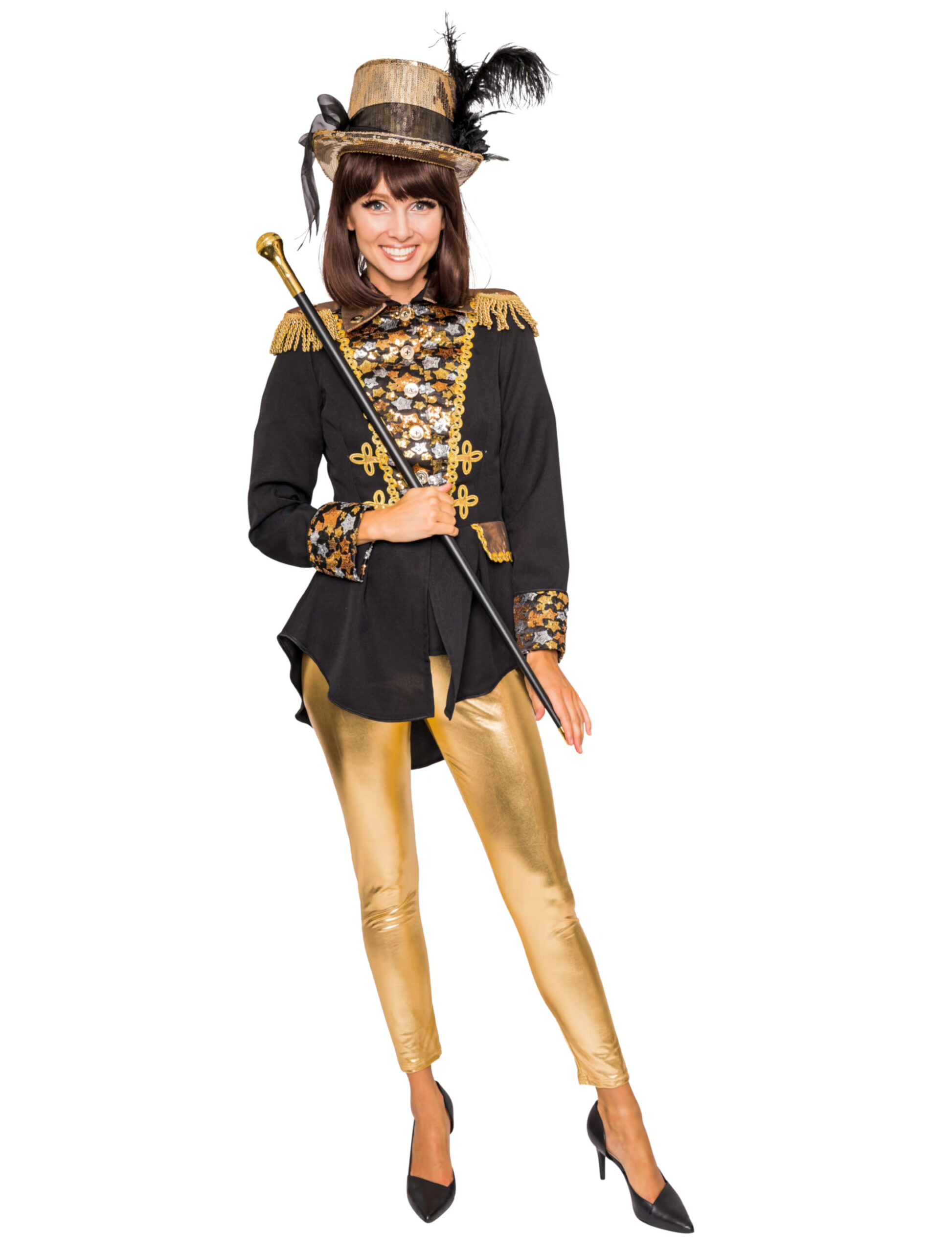 Ein Mantel extra für Frauen geschnitten. Mit diesem Mantel kannst Du Dir passend zu Deinem Partner ein Kostüm erstellen. Der Mantel ist schwarz und mit goldenen und silbernen Sternen verziert. Die Schulterklappen mit goldenen Fransen lassen Dich in einem goldenen Glanz erstrahlen. Mit Accessoires wie einer passenden Leggings und einem schicken Hut kannst Du in jede Manege treten und das Publikum zum staunen bringen.