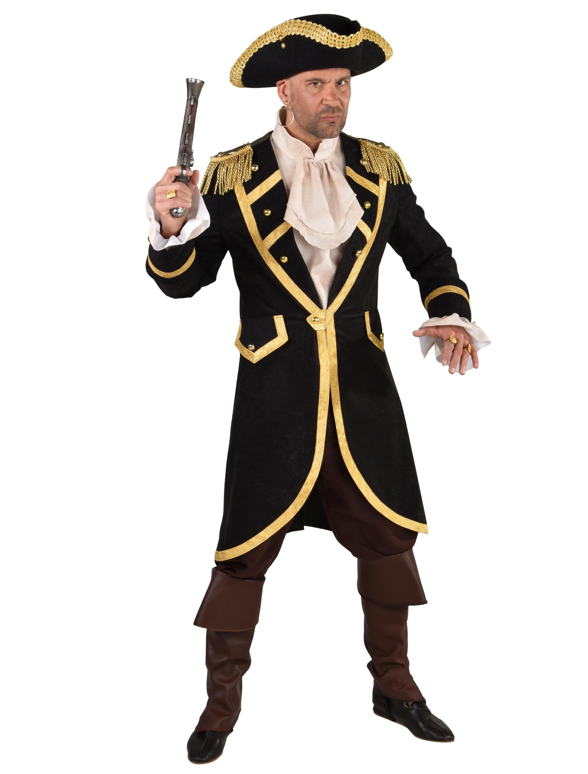 Als erster Offizier trägst Du besonders extravagante Kleidung! Dieser edle Mantel übertrifft Deine hohen Ansprüche sogar: Das aus schwarzem Stoff bestehende Kleidungsstück reicht bis zu den Knien und ist rundum mit goldfarbenen Säumen verziert. Hingucker sind auch die Schulterklappen mit den auffälligen Fransen, die vielen Knöpfe und der asymmetrische Schnitt am Mantelsaum. Durch einen Knopf in der Front kannst Du den Mantel bequem schließen. Dein Herren Offizier Kostüm kannst Du mit einem Hut, ein Jabot und Stiefel perfekt ergänzen!