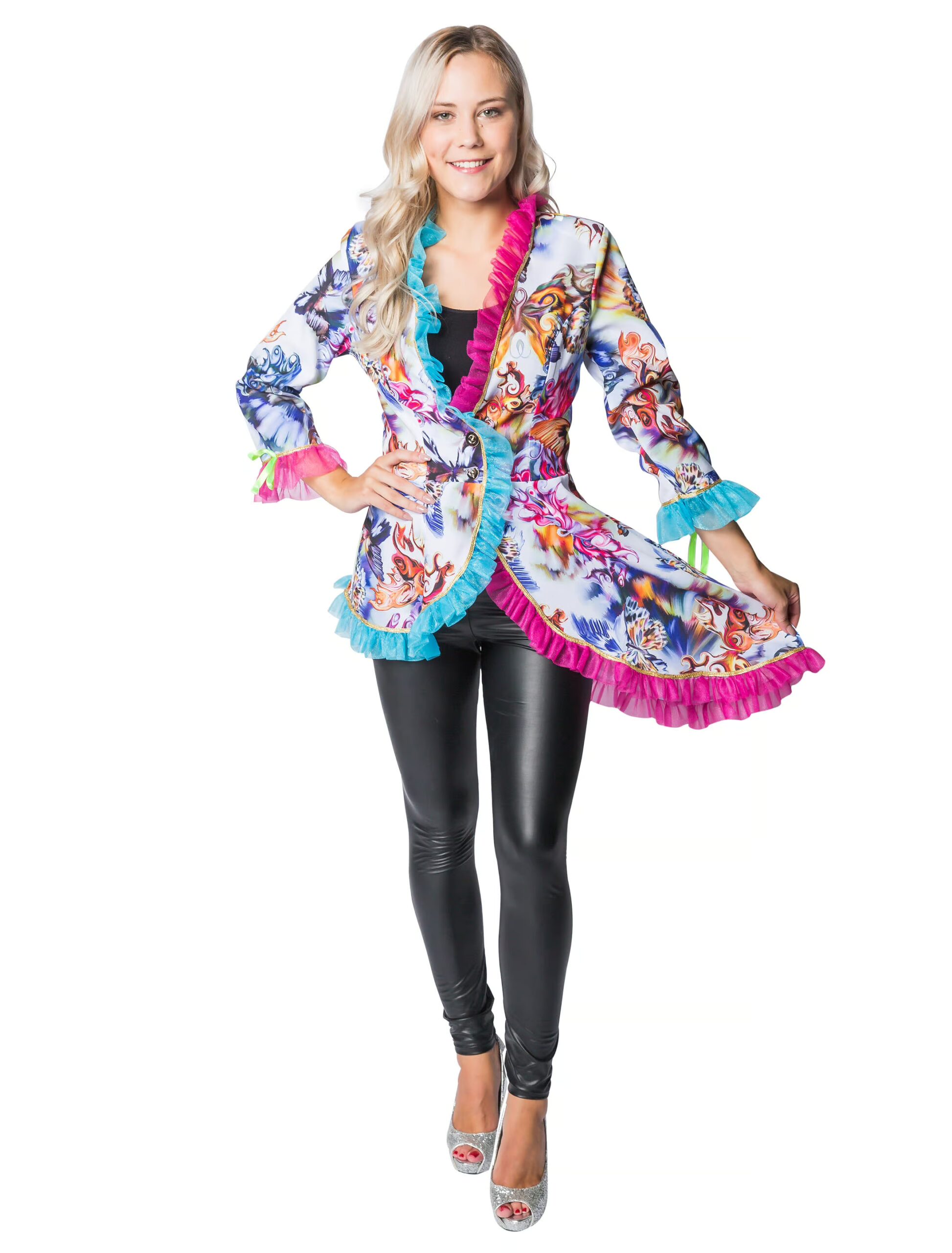 Oh, là , là ! Dürfen wir vorstellen: Der perfekte Mantel für alle Damen, die sich gerne extravagant kleiden und sich gerne von der Masse abheben! Das auffällige Kleidungsstück ist mit vielen bunten Schmetterlingen verziert, die ihm eine sommerliche Note verleihen. Rundum ist der Damen Mantel mit pinken und blauen Rüschen sowie an den Ärmeln zusätzlich mit neongrünen Schleifen verziert. Dazu passt besonders gut ein weit ausgestellter Tüllrock. Ein farbenfrohes Highlight, das jedem Deiner Kostüme eine ganz besondere und vor allem einzigartige Note verleiht! Exklusiv Artikel.