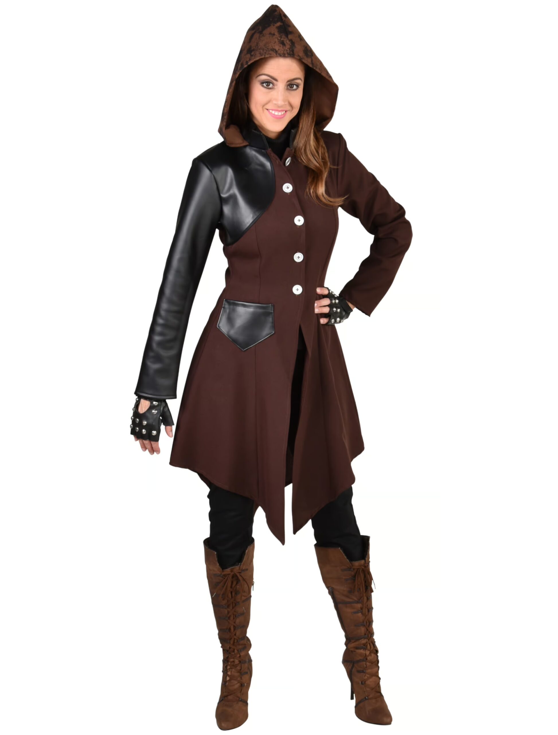 Bist Du bereit für Deinen perfekten Auftritt auf der kommenden Halloweenparty? Dieser edle Mantel steht jeder Frau und besticht durch die vielen Details: Der braune Stoff wird in der Front von einer weißen Knopfleiste und seitlich von einer aufgenähten Tasche in schwarzer Kunstleder-Optik verziert. Dazu passend besteht auch einer der Ärmel aus dem schwarzen Stoff in Kunstleder-Optik. Weitere Hingucker des Damen Mantels sind die Schnürung am Rücken und die geheimnisvoll wirkende Kapuze. In Kombination mit passenden Accessoires verwandelst Du Dich im Nu zum stilechten Steampunk!