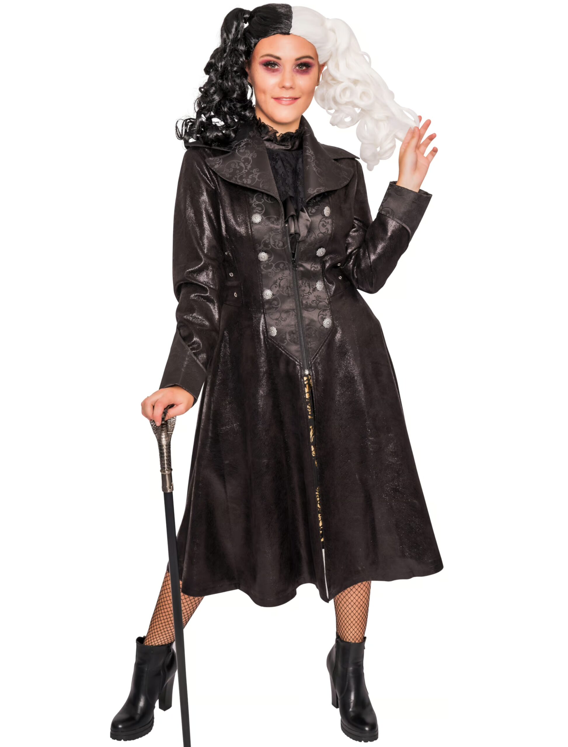 Steampunk von Kopf bis Fuß! Dieser hübsche Mantel verwandelt Dich in einen echten Hingucker auf Halloween oder Karneval. Das Kleidungsstück aus glänzendem, schwarzem Stoff reicht bis unter die Knie und ist an den Ärmelsäumen, am Kragen und Revers mit einem floralen Muster verziert. Zusätzlich wird der Mantel in der Front von edlen, silberfarbenen Knöpfen geschmückt. Der kurze Reißverschluss gewährt Dir jede Menge Beinfreiheit. Ob offen oder geschlossen getragen, dieser Steampunk Mantel für Damen sieht unglaublich cool und lässig aus und steht jeder Frau!