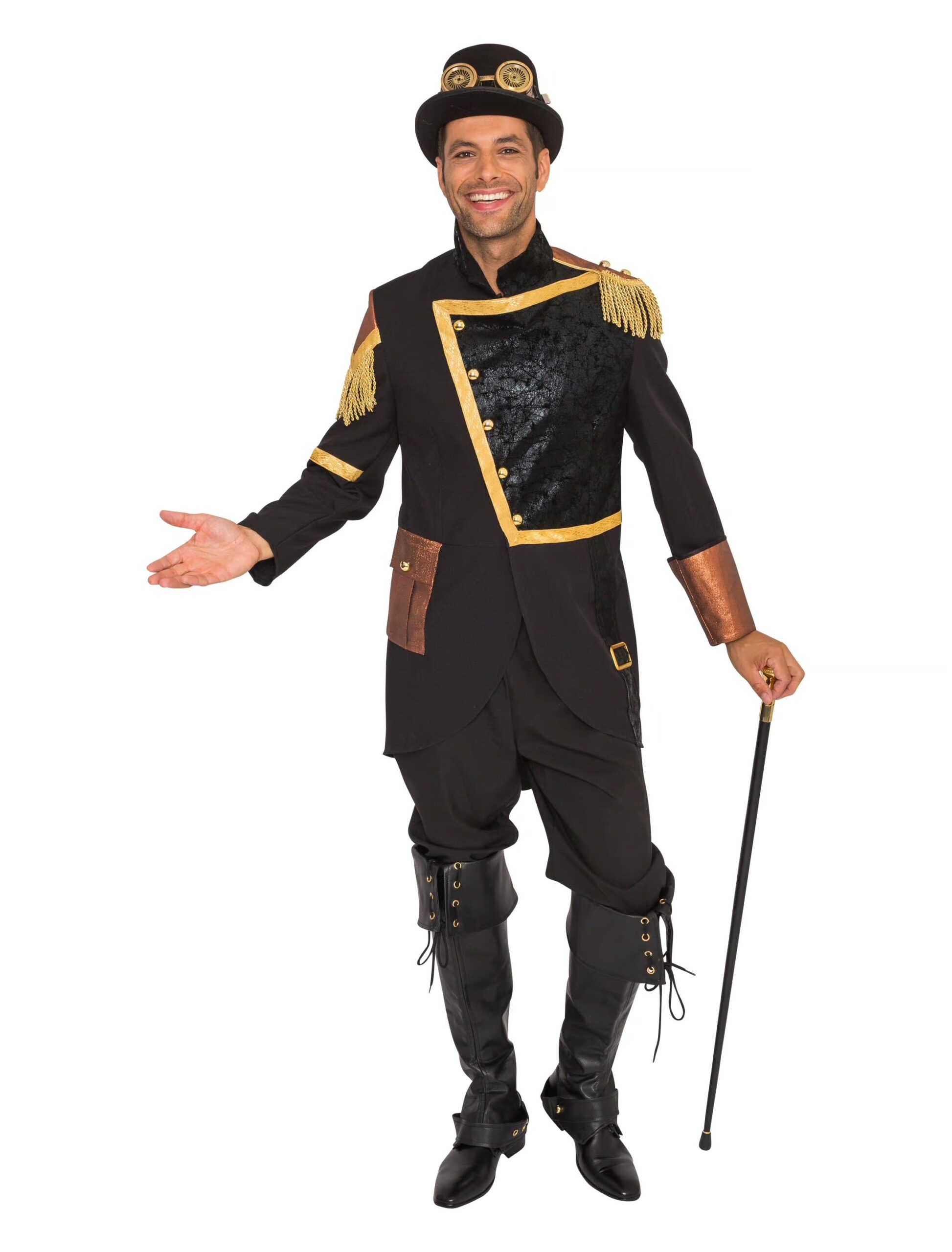 Mache an Karneval eine fantastische Zeitreise in die Vergangenheit mit unserem ausgefallenen Steampunk Mantel für Herren. Der schwarze Mantel für Anhänger von Jules Verne Romanen hat ein attraktives, asymmetrisches Design, das sofort positiv ins Auge fällt. Zusammen mit einem schwarzen Zylinder und ledernen Stiefeln kannst Du den Coat auch auf Steampunk Mottopartys, Events oder Messen tragen. In mehreren Größen lässt sich der Mantel in Schwarz bestellen, der von goldenen Knöpfen und Schulterstücken geziert wird. Passend dazu kannst Du einen Gehstock zum Feiern mitnehmen oder viele Zahnrad Accessoires aus unserem Shop. Exklusiv Artikel.
