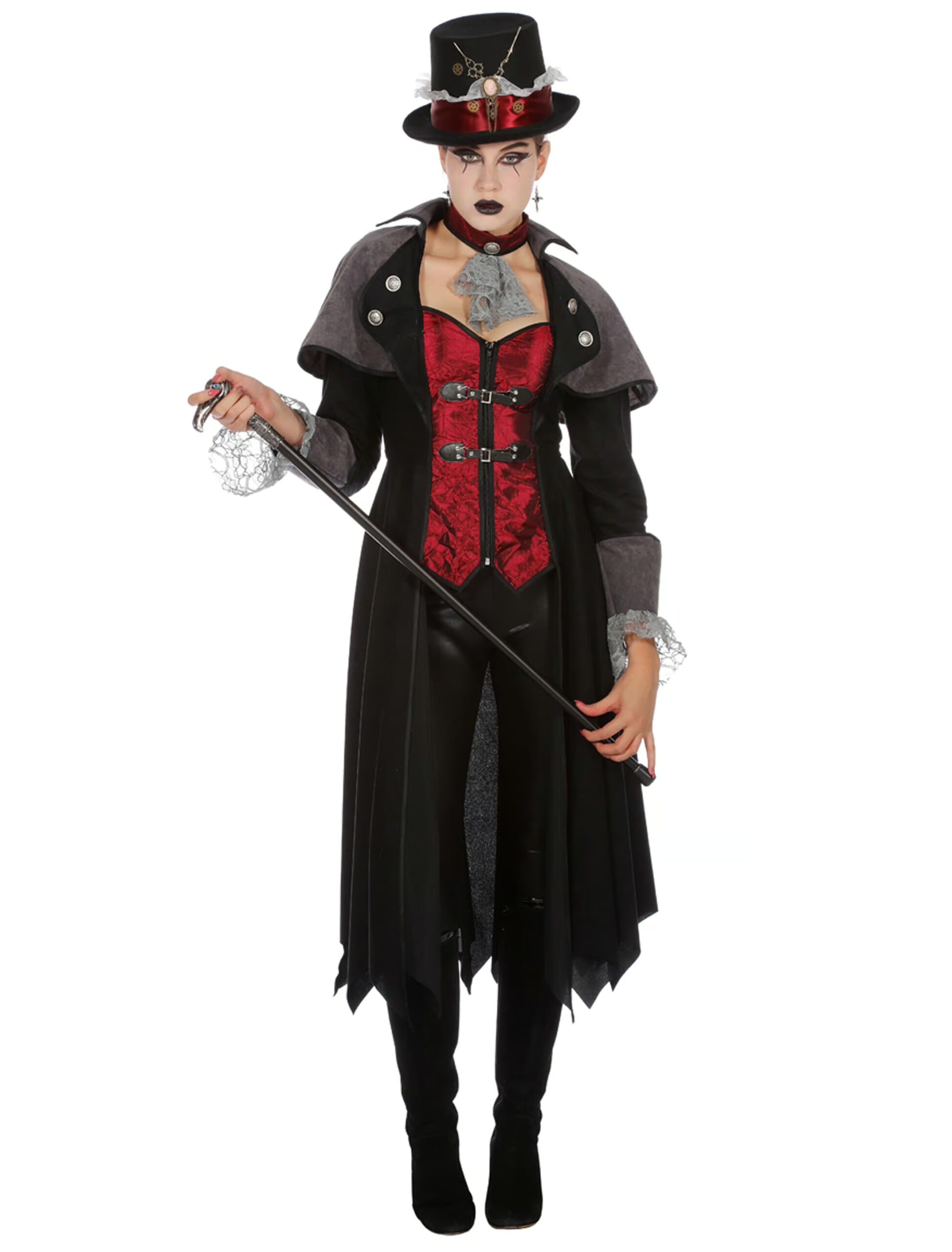 Werde zum hübschesten Blutsauger auf jeder Kostüm- und Halloweenparty! Mit diesem edlen Vampir-Mantel für Damen ist nichts einfacher als das: Er überzeugt nicht nur durch den taillierten Schnitt und den langen Stoff, der am Saum zackig geschnitten ist, sondern auch durch den ausladenden Kragen mit Knöpfen und den mit Spitze verzierten Ärmelsäumen. Absoluter Hingucker ist das am Mantel angenähte rote Korsett mit den zwei Schnallen. Zum schaurig-schönen Mantel gehört auch das edle Jabot mit großem Knopf und grauer Spitze. Mit der passenden Gesichtsschminke machst Du Deinen düsteren Auftritt perfekt!
