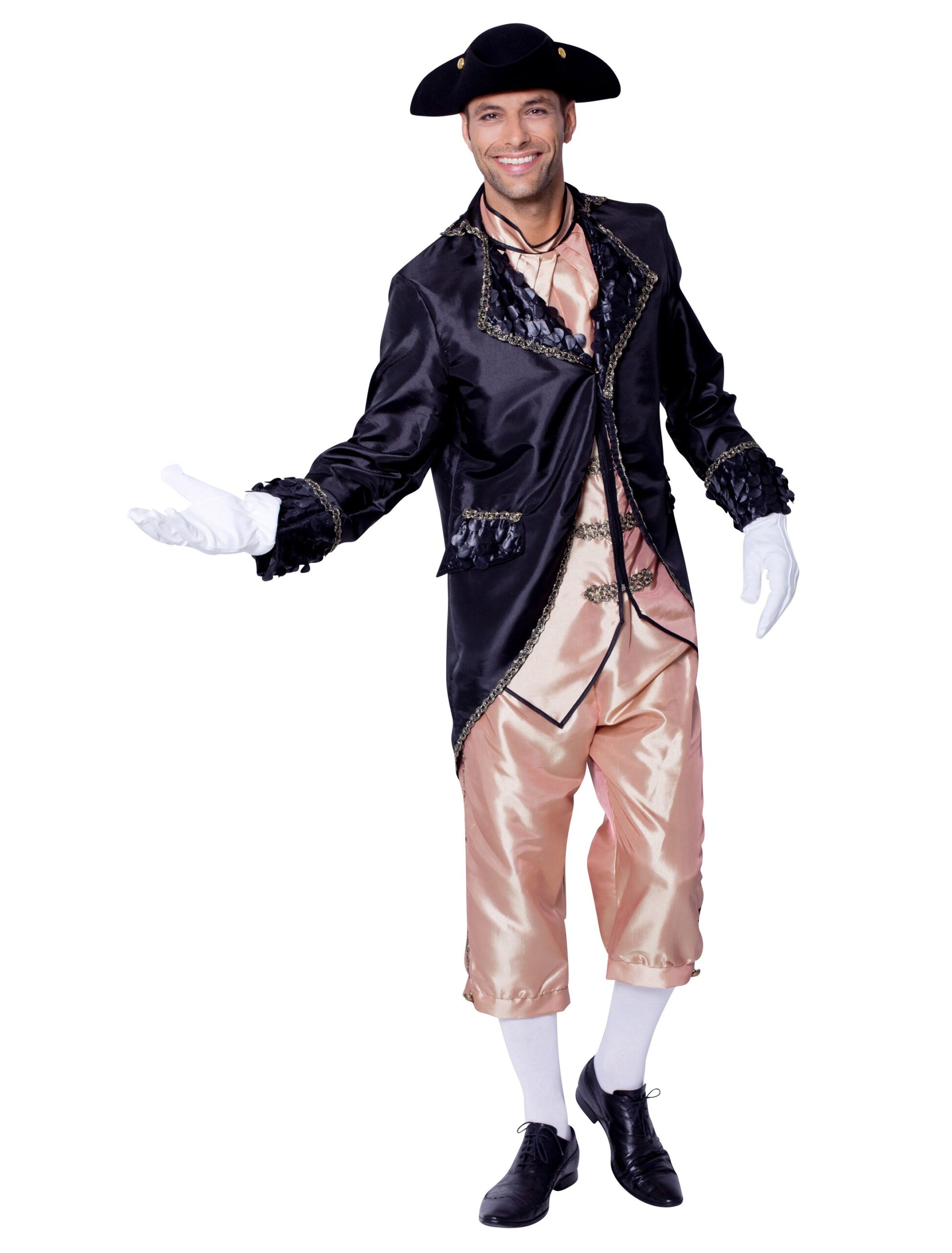 Stilbewusstsein und Eleganz war die wichtigste Tugend der edlen Adeligen der damaligen Zeit! Überzeuge auch Du auf Deiner Karnevals- oder Mottoparty als eleganter Marquis in diesem originalgetreuen und hochwertigen Kostüm für echte Edelmänner! Das Kostüm besteht aus Hose, Jacke mit eingenähter Weste sowie einem Jabot, einer Art Halsband. Die Kniebundhose ist aus Stoff in Satin-Optik gefertigt und ist mit goldenen Knöpfen und Borten entlang der seitlichen Beinlängen verziert. Der elastische Hosenbund bietet bequemen Tragekomfort die ganze Nacht oder den ganzen Tag. Die Jacke ist mit einer eingenähten Weste ebenfalls in goldenem Satin-Stoff versehen und wird mithilfe eines Reißverschlusses in der Front verschlossen. Die Weste zieren ebenfalls goldene Borten passend zur Hose. Die darüber liegende Jackett Jacke ist aus schwarzem Stoff in passender Satin-Optik gefertigt. An den Ärmelsäumen dem Kragen sowie den Taschenansätzen befinden sich hochwertige Stoffapplikationen, die die Jacke