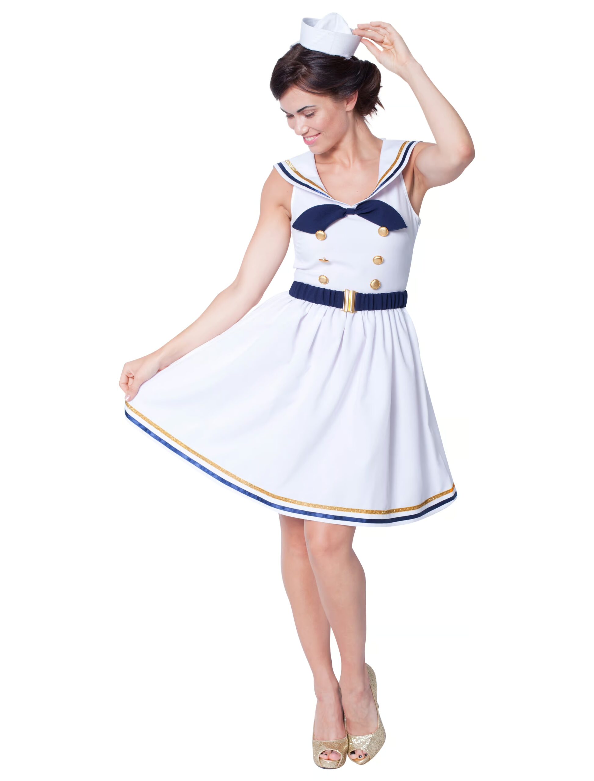 Das Maritime Flair von Kreuzfahrten – der raue Wind der See – Möwen erklingen im Hintergrund – ein Traum-Urlaub! Nur noch schöner als solch ein Urlaub wird wohl der Karneval in diesem Kleid sein! Mit seinem figurbetontem Oberteil und dem klassischen Matrosin-Kragen kommt es edel und verspielt daher. Dunkelblaue und goldene Details wie das Band an Ausschnitt und Rock-Saum setzen freche Akzente. Der Rock bringt durch seinem leicht ausgestellten Schnitt und lockeren Faltenwurf eine mädchenhafte Ausstrahlung. Kombiniert mit weißen Overknee-Strümpfen wird es noch etwas frecher. Fazit: eine süße Uniform, die verspielte und klassische Elemente gekonnt vereint. Das perfekte Kostüm für Deine Karnevals- oder Mottoparty.