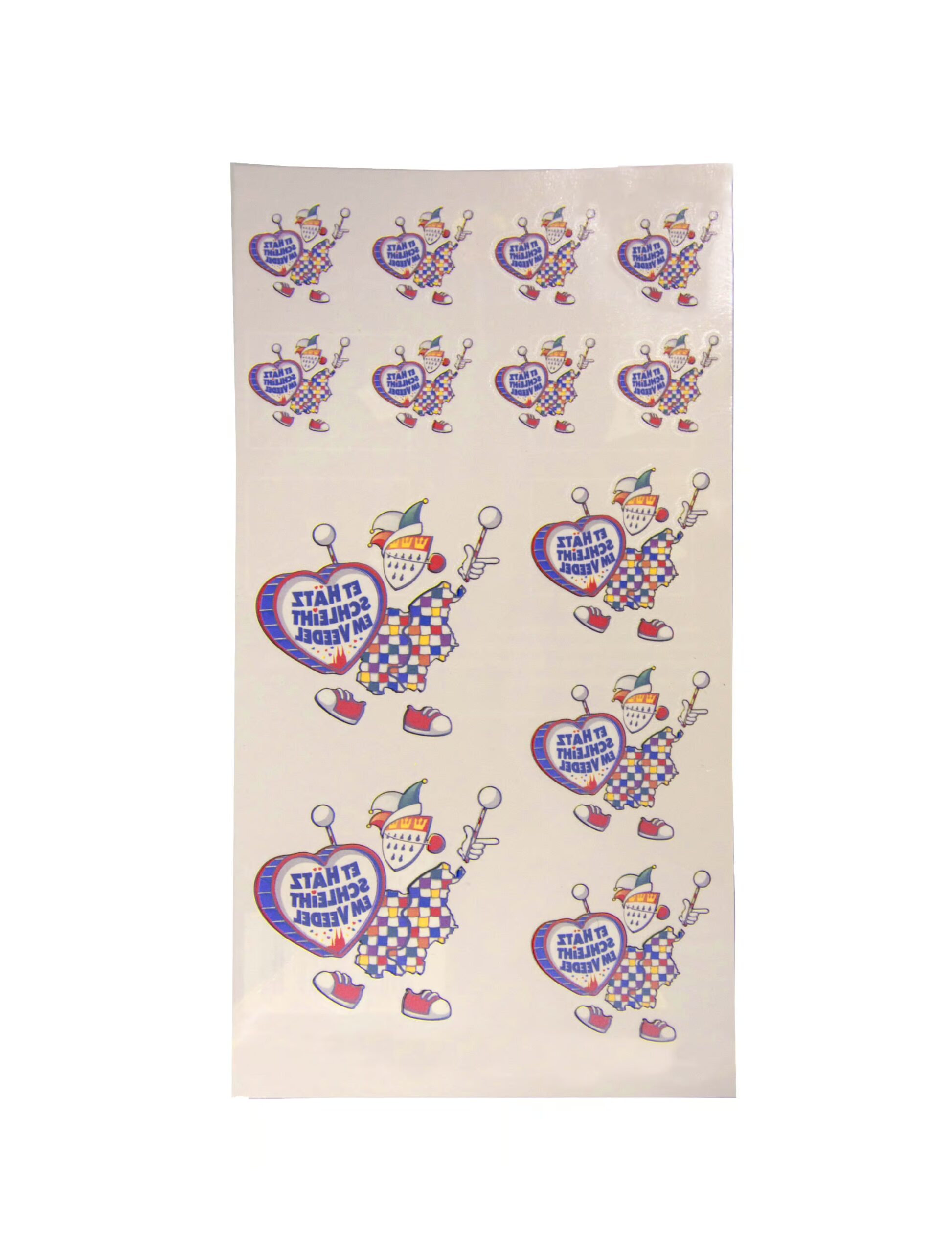 Verrückter und auffälliger kannst Du gar nicht zeigen, wie stolz Du auf Dein Veedel bist! Diese 13 Motto-Tattoos der Karnevalssession 2019/2020 dürfen bei Deinem Motto-Outfit nicht fehlen. Gezeigt wird ein auf der Trommel spielender Karnevals-Jeck, wie z. B. im Karnevalszug die verschiedenen Tambourcorps aus unseren Stadtvierteln. Die Tattoos lassen sich ganz einfach mit einem feuchten Tuch z. B. auf Arme, Gesicht oder Hände anbringen. Trage das Kölner Karnevalsmotto raus in die bunte Karnevals-Welt: “Et Hätz schleiht em Veedel”!