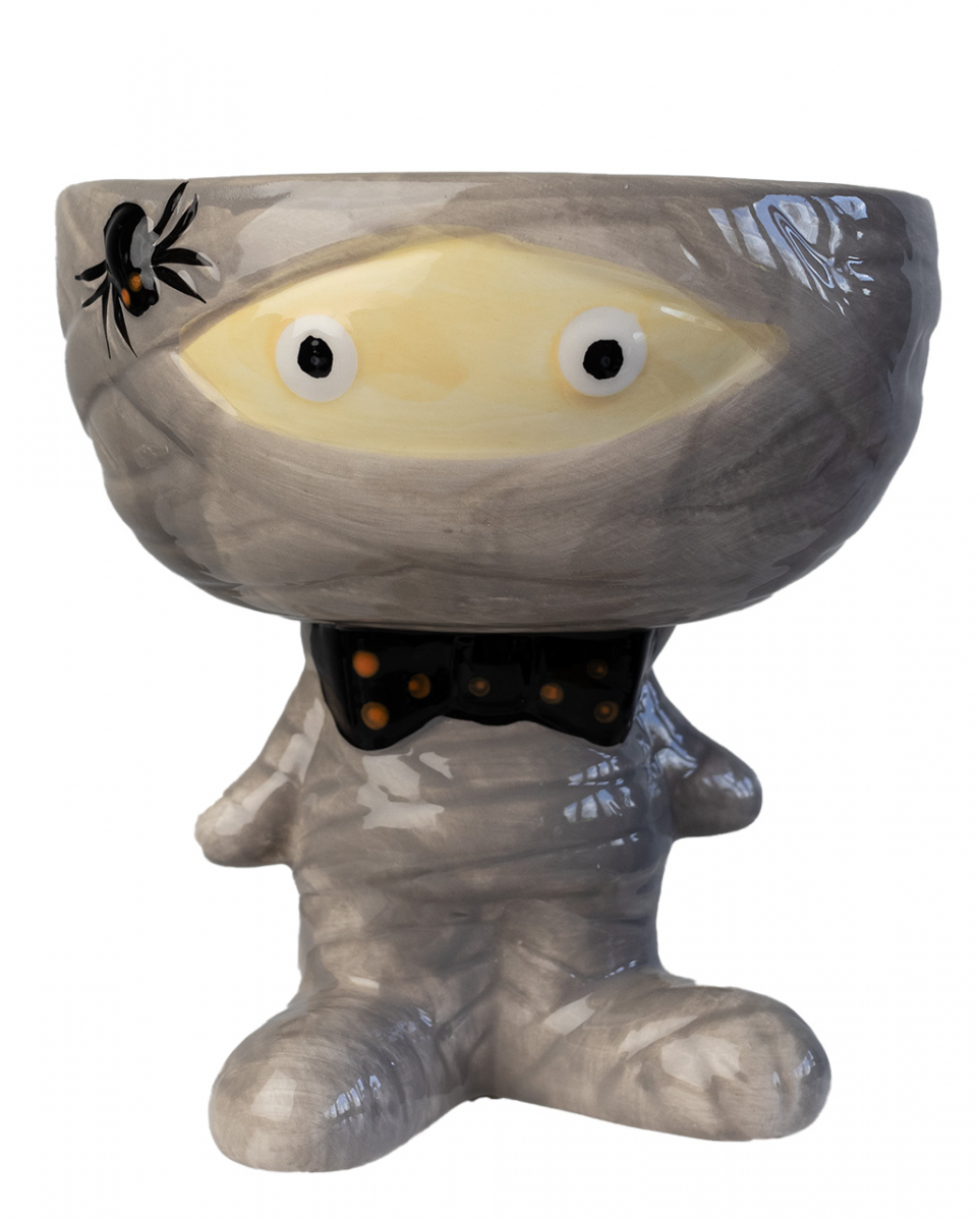 Mumie Süßigkeitenschale mit Fliege und Spinne für Halloween 14cm Trick or Treat Mumien Schüssel im kindgerechten Design Drops, Schokoriegel und Gummibärchen finden in der Mumie Süßigkeitenschale ein schönes Plätzchen. Die witzige Trick-or-Treat-Schüssel im Mumien Design ist ideal, um sie am 31. Oktober im Eingangsbereich zu platzieren. Unsere Mumie Süßigkeitenschale mit Fliege und Spinne für Halloween ist ein Partyzubehör für Trick or Treat. Die Keramikschale ist hochwertig verarbeitet und mit kinderfreundlichen Details verziert. Lieferumfang: 1 x Süßigkeitenschale Mumie 14cm Farbe: Grau, Rosa, Schwarz, Orange, Weiß Größe: ca. 14 cm Material: 100 % Keramik Halloween Schale für Saures Spooky Mumien Schüssel für Trick or Treat Freches Design Hochwertige Verarbeitung kinderfreundliches Design Schwarze Spinne als Blickfang Der Artikel ist ein Kostümzubehör für Erwachsene und kein Spielzeug. Nicht für Kinder unter 3 Jahren geeignet. Kann Kleinteile enthalten, die verschluckt werden können – Erstickungsgefahr. Von Feuer und offenen Flammen fernhalten.