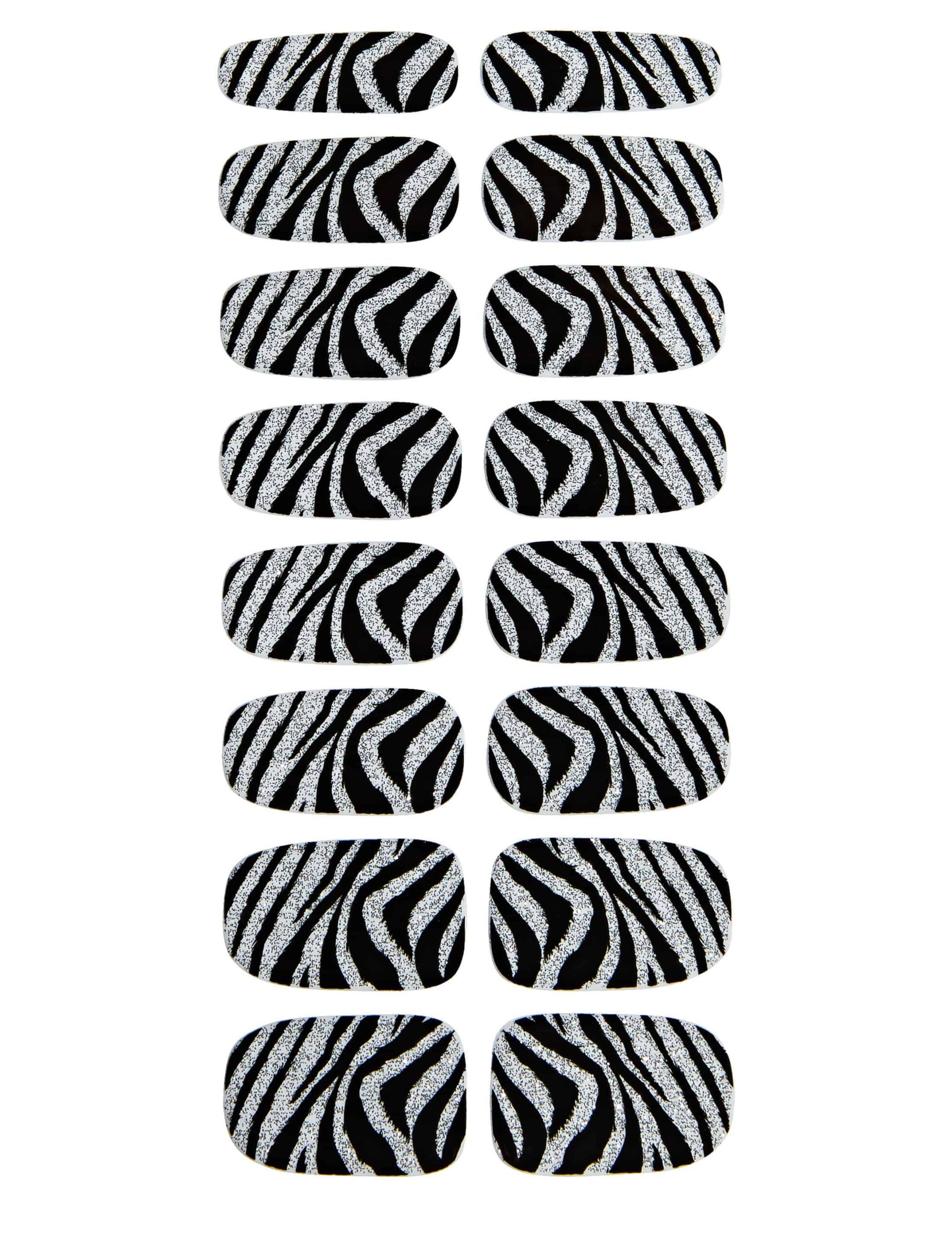 Du bist auf der Suche nach einem tierischen Accessoire für Dein Zebra Kostüm? Diese 16 Nagelsticker im Zebra-Look dürfen hier nicht fehlen. In Schwarz mit silbernen Streifen machen die Nagelsticker richtig was her. Der perfekte Dekor für Deine Fingernägel an Karneval und Fasching.