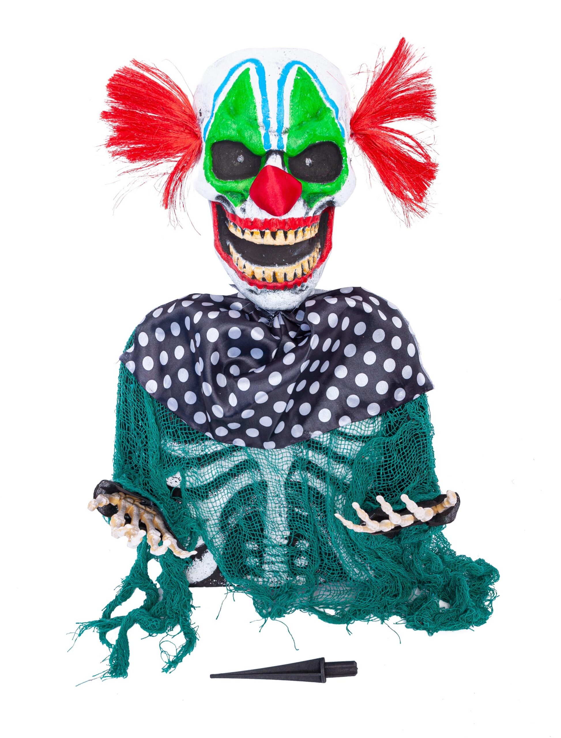 Mit dieser gruseligen Garten Deko wird Deine nächste Halloween Party zum Grusel-Hit! Dieser Clown Oberkörper zum Aufstellen verfügt über batteriebetriebene leuchtende Augen, die im Dunkeln besonders zur Geltung kommen. Die Skeletthände des Clowns können in eine andere Position gerückt werden. So kannst Du den Clown individuell gestalten, damit er perfekt zu Deiner Halloween Deko passt.