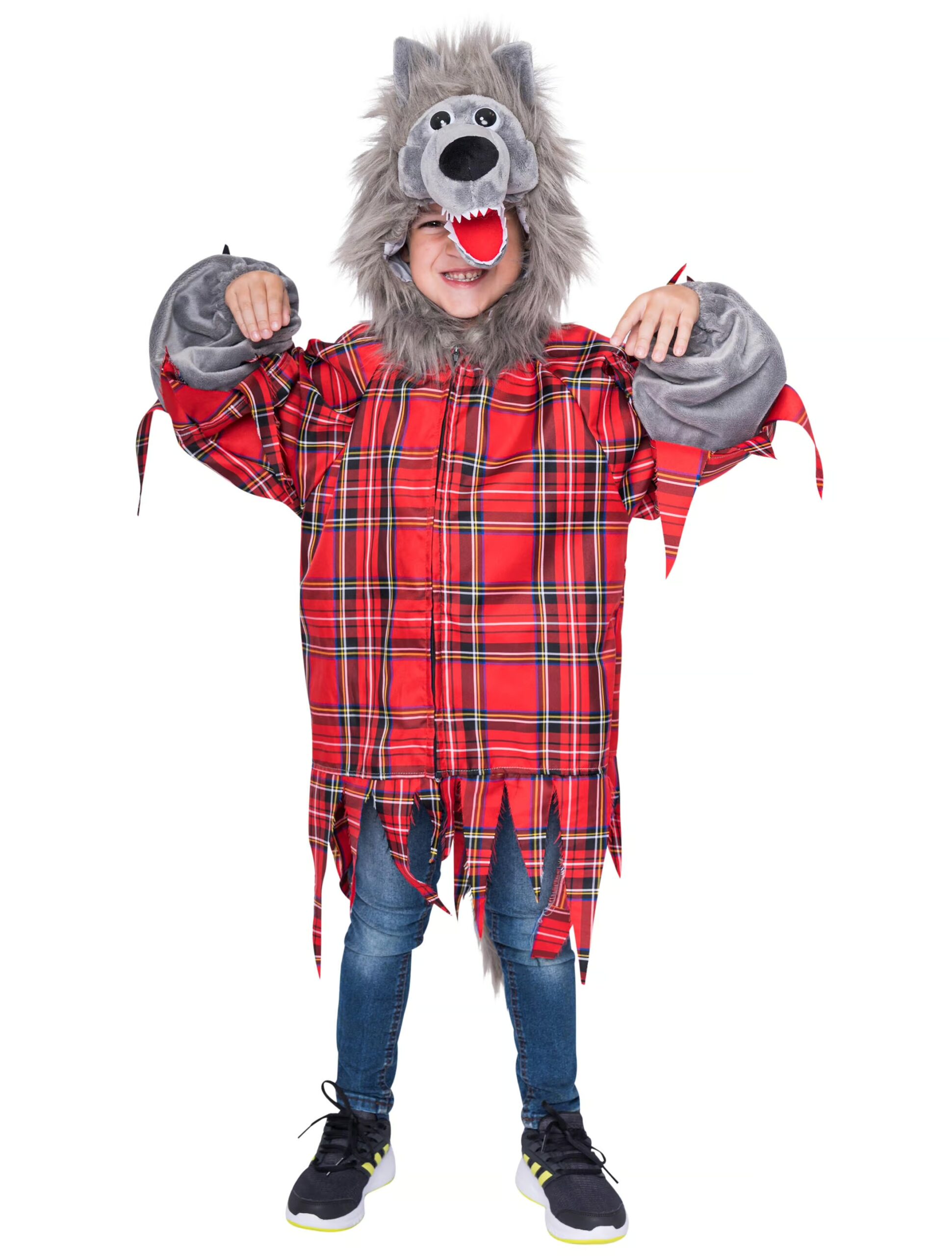 Mit diesem aparten Oberteil aus Polyester wird Dein Kind zu einem angsteinflößenden Werwolf, der in mondhellen Nächten, zu Halloween oder Fasching sein Unwesen treibt und seine Mitmenschen erschreckt. Das originelle Kostümteil besteht aus einer langen, rotkarierten Jacke mit Fetzen an Ärmeln und Jackensaum, einer grauen Wolfskapuze aus Plüsch, grauen Plüschstulpen und dem buschigen Wolfsschwanz. Sie wird mit einem Reißverschluss geschlossen und kann über der Kleidung getragen werden, sodass Dein kleiner Werwolf auch beim Straßenfasching in schön warmer Kleidung steckt.
