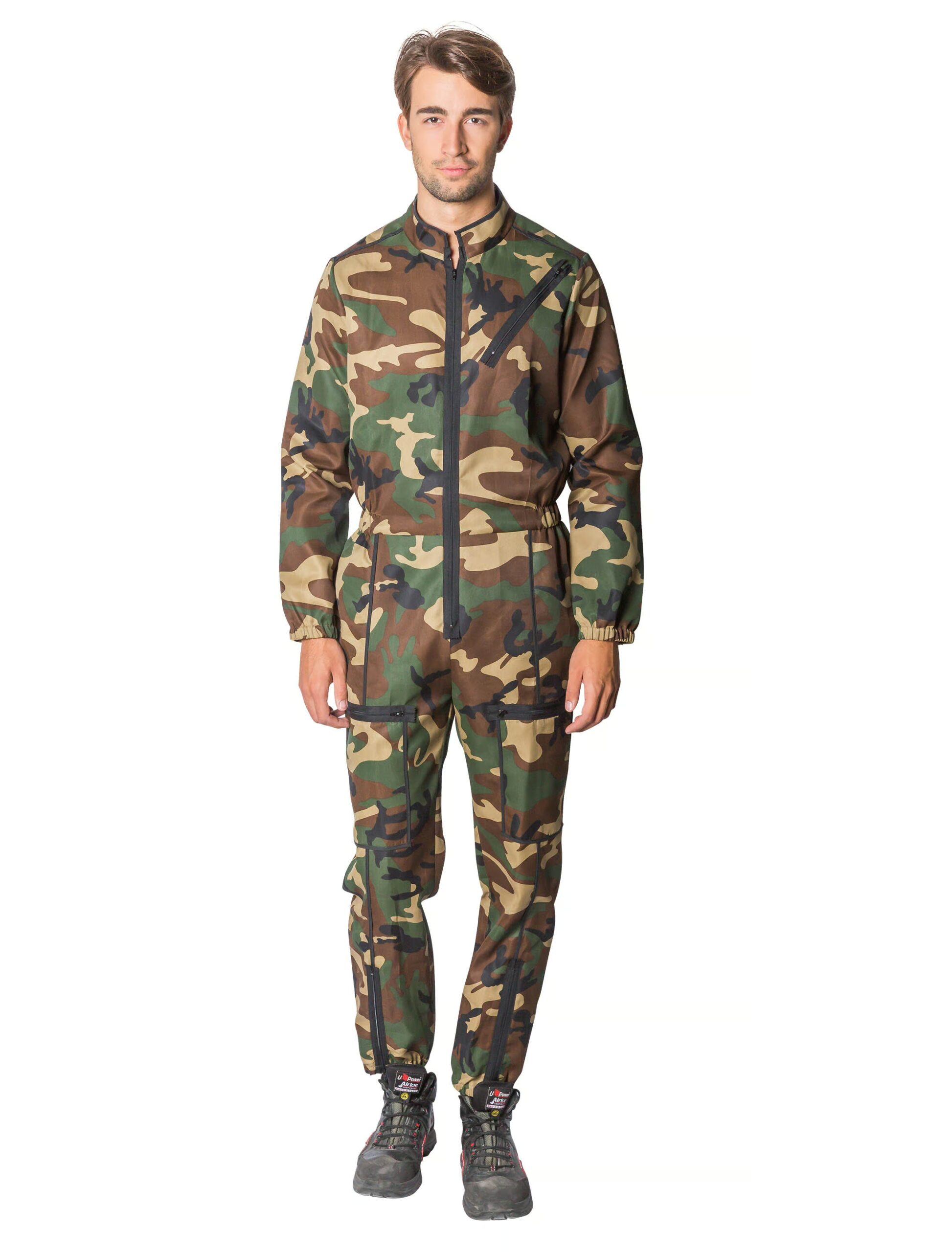 Gut getarnt und doch sehr auffällig! Während Du im Wald mit diesem Ganzkörperkostüm gut getarnt wärst, bist Du auf Karnevalspartys genau das Gegenteil. Denn dieser Overall in einem grün-braun-schwarzen Camouflage-Muster fällt dort garantiert auf! Das Herren Ganzkörperkostüm im Bundeswehr-Look ist rundum mit vielen schwarzen Reißverschlüssen verziert. In der Front lässt es sich bequem durch einen großen Reißverschluss öffnen und schließen. Weitere Hingucker sind der Stehkragen, die Ärmel und Beine mit Gummizug und der leicht taillierte Schnitt. Ein Highlight für alle, die für einen Tag beim Militär arbeiten†möchten!