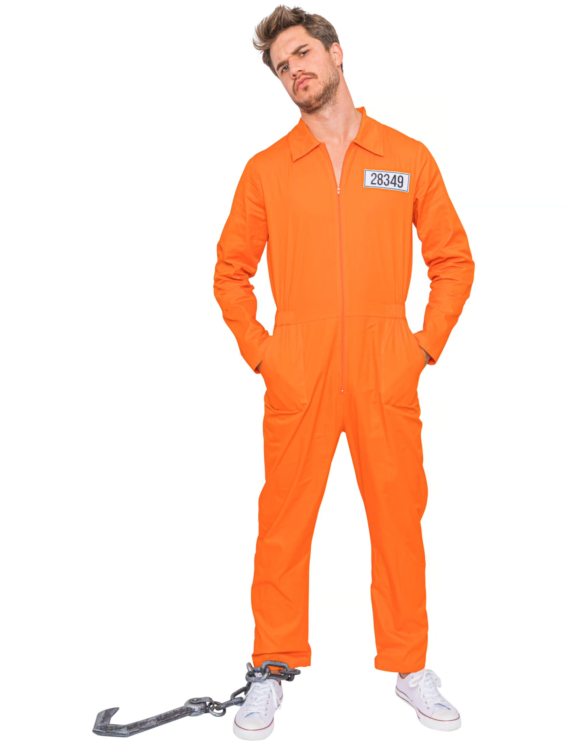 Als knallharter Verbrecher im orangenfarbenen USA Gefangenen Overall sorgst Du auf jeder Karnevalsfeier und Themenparty sowie auf Junggesellenabschieden für richtig viel Aufsehen. Die Sträflingskleidung besteht aus dem orangenen Baumwolloverall mit verdecktem Reißverschluss, seitlichen Gummizügen im Taillenbereich sowie geräumigen Seitentaschen. Die große schwarze Gefangenennummer auf der linken Brustseite macht ihn als Gefängniskluft besonders authentisch. “Schwere” Eisenkugel und Handschellen aus unserem Shop lassen Dich besonders gefährlich wirken. Oder Du entscheidest Dich für die Variante Ausbrecher mit Säge und Feile. In diesem Fall kannst Du sicher sein, das mindestens eine der Faschingsschönen gern Deine Fluchthelferin wäre.