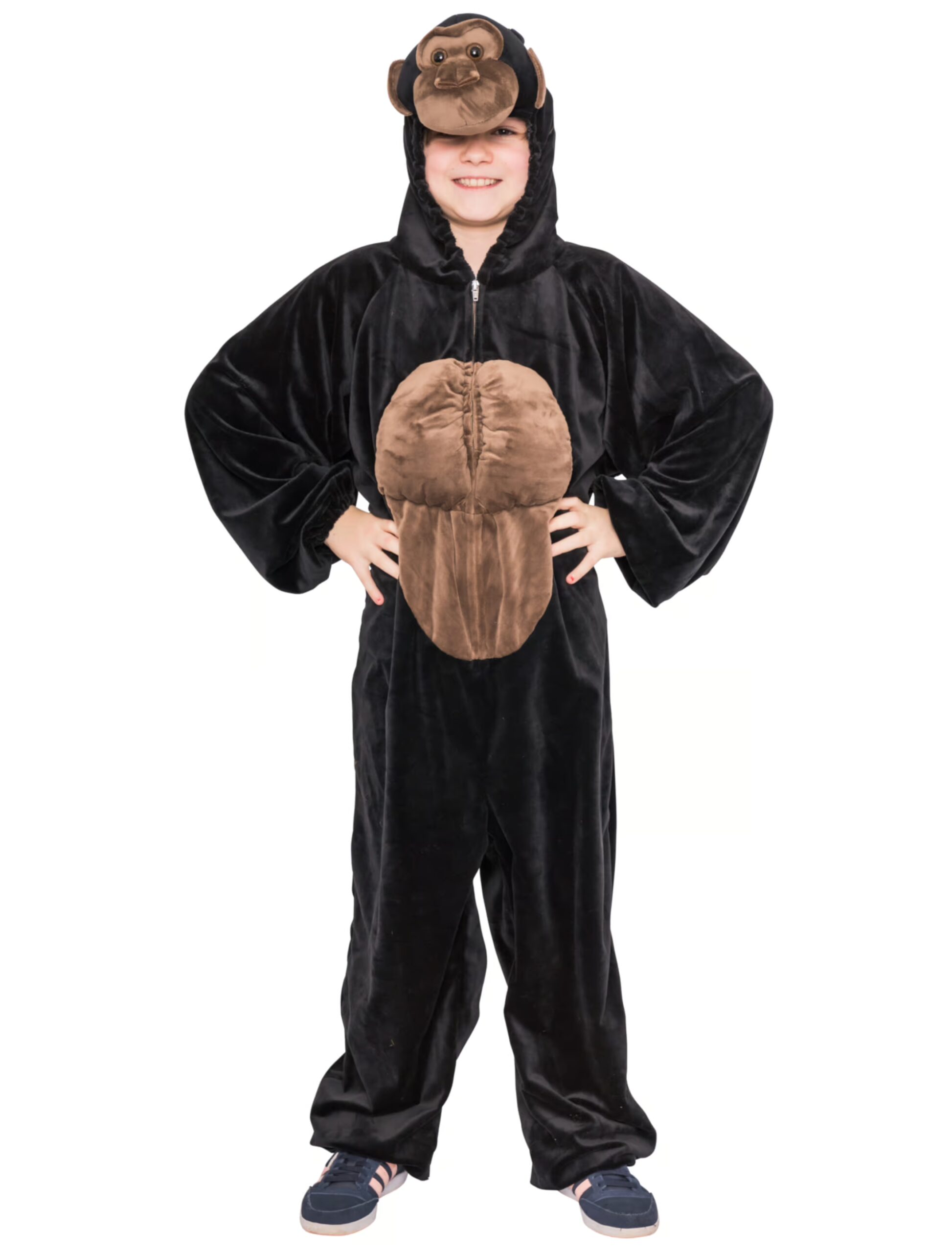 Wenn Du noch auf der Suche nach einem ausgefallenem und lustigem Kinder-, Gruppen- oder Familienkostüm bist, dann ist der Gorilla genau das Richtige für Dich. Der Overall ist aus einem kuscheligen und weichen Material und lässt sich über einen Reißverschluss schnell und einfach Anziehen. Der dunkelbraune Overall hat, wie es sich für den größten der Affen gehört, natürlich eine stolz erhobene hellbraune Brust und auf der Kapuze ist ein großer Affenkopf aufgenäht. Weitere Accessoires findest Du direkt hier im Shop.