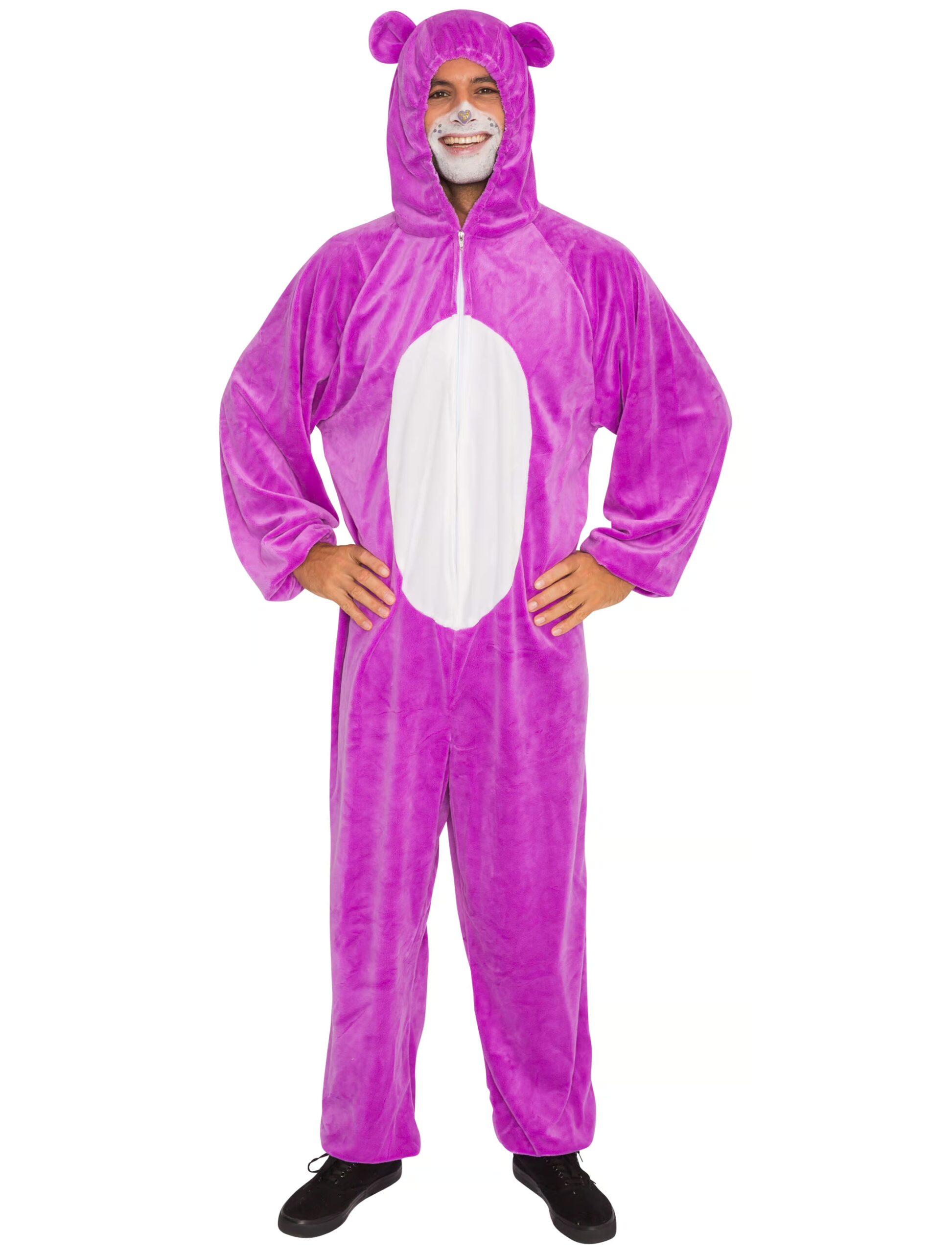 Du suchst nach einem Bärenkostüm in verschiedenen Farben für Karneval und Fasching? Dieser lilafarbene Bären Plüschoverall für Herren passt doch perfekt. Der Overall besitzt einen Bärchen-Kopf als Kapuze, der mit einem Gummizug versehen ist. Mit der Hilfe eines Reißverschlusses in der Front wird der Overall verschlossen. Die Fuß- und Ärmelenden sind ebenfalls mit Gummizügen versehen und sind für die Hände und Füße mit Gummibänden ausgestattet, um sie einfach umzubinden. Ein Puschelschwanz ist ebenfalls an dem Overall vernäht.