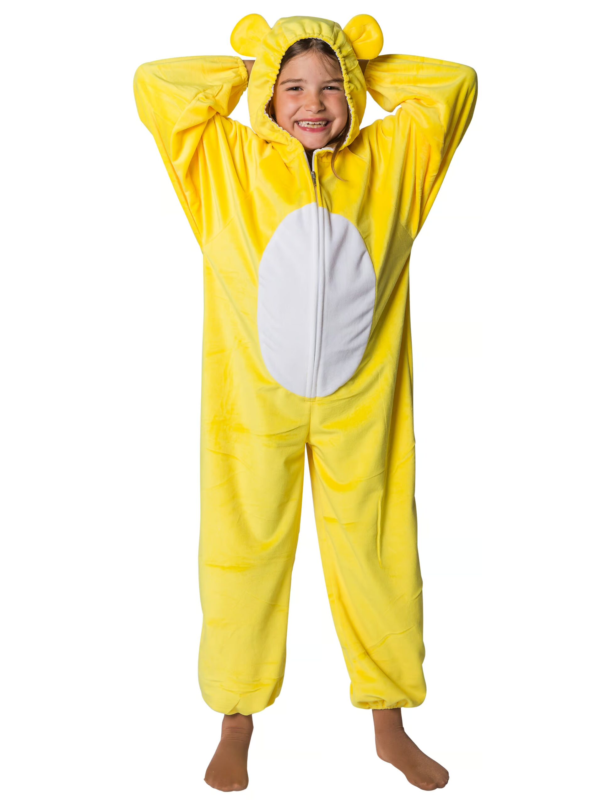 Du bist auf der Suche nach einem süßen Bären Kostüm für die kalten Tage? Dann darf dieser Plüsch Bärchen Overall in Gelb für Kinder in Größe 98-128 nicht fehlen. Der Overall besitzt einen Bärchen-Kopf als Kapuze, der mit einem Gummizug versehen ist. Mit der Hilfe eines Reißverschlusses in der Front wird der Overall verschlossen. Die Fuß- und Ärmelenden sind ebenfalls mit Gummizügen versehen und sind für die Hände und Füße mit Gummibänden ausgestattet, um sie einfach umzubinden. Ein Puschelschwanz ist ebenfalls an dem Overall vernäht. Der Overal ist aus 100% Polyester gefertigt. Ein schönes und warmes Kostüm für Karneval und Fasching.