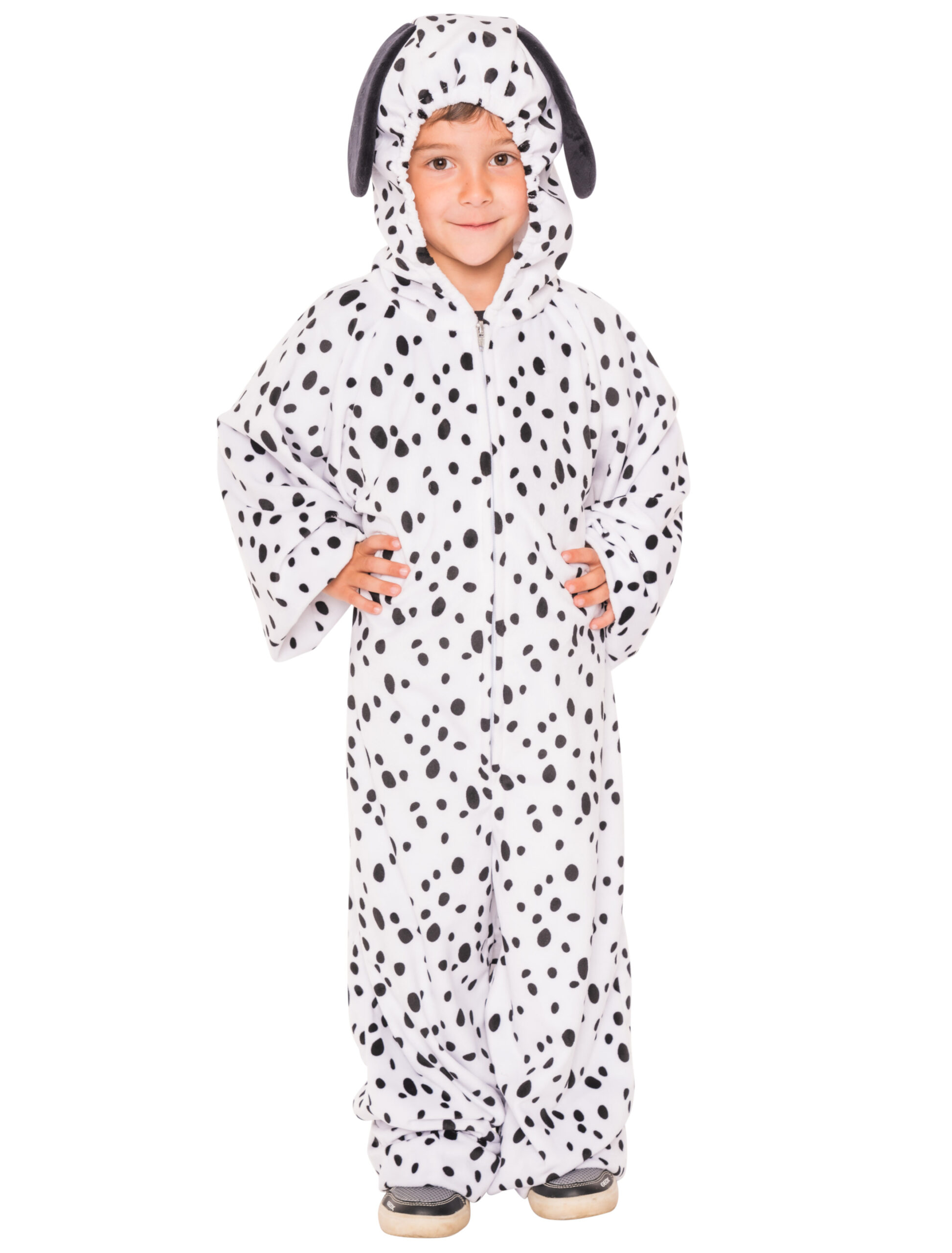 Ganz zauberhaft ist dieser entzückende Dalmatiner-Overall für Kinder aus weichem und warmen Plüsch, mit dem Du Deinen kleinen Liebling zum Fasching oder zum Kindergeburtstag in einen süßen, kleinen Dalmatinerwelpen verwandeln kannst, der allen Anwesenden ein Lächeln ins Gesicht zaubert. Der niedliche, weiße Overall mit den vielen schwarzen Punkten, der Hundekopf-Kapuze mit den schwarzen Schlappohren sowie dem rückseitigen Dalmatinerschwänzchen wird mit einem praktischen Reißverschluss geschlossen. Er ist nicht nur ideal als Faschingskostümierung für Deinen kleinen Racker, sondern er ist auch ein toller Spiel- und Freizeitanzug, den Dein Kind lieben wird.