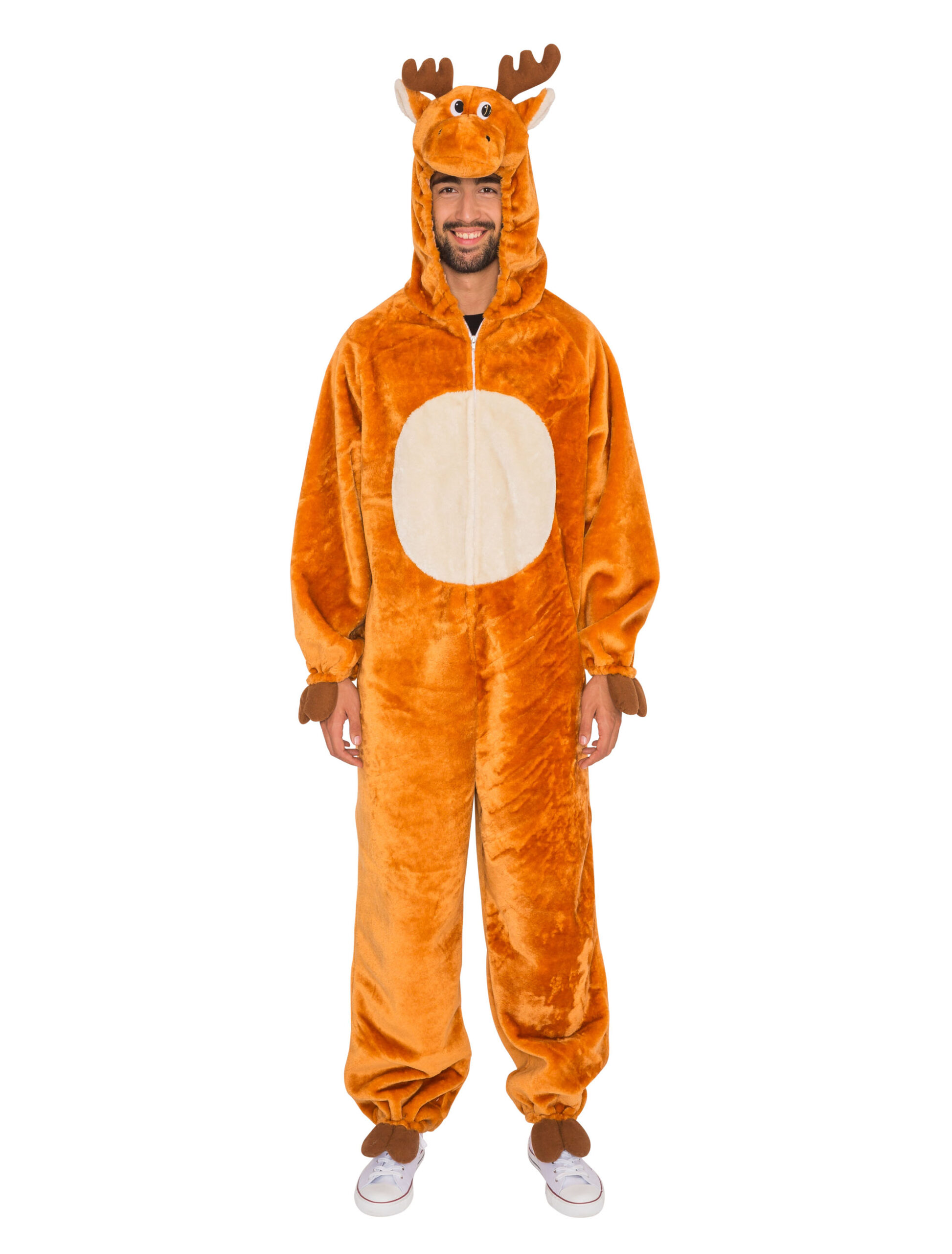 Du suchst nach einem warmen Kostüm für Karneval, Weihnachten oder Fasching? Dann bist Du bei diesem Hirsch Plüschoverall für Herren genau richtig. Der Overall besitzt einen Hirsch-Kopf als Kapuze, der mit einem Gummizug versehen ist. Mit der Hilfe eines Reißverschlusses in der Front wird der Overall verschlossen. Die Fuß- und Ärmelenden sind ebenfalls mit Gummizügen versehen und sind für die Hände und Füße mit Gummibänden ausgestattet, um sie einfach umzubinden. Elch.