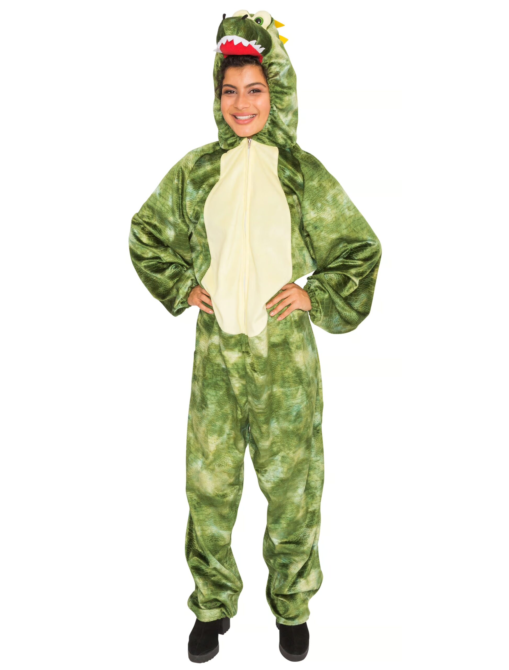 Der grüne Dinosaurier Overall für Damen ist aus warmem Plüsch-Stoff gefertigt und wird in der Front mit einem praktischen Reißverschluss verschlossen. An Armen und Beinen befinden sich Fuß- und Fingerstulpen in Dinosaurier Tatzen-Form. Besonderer Blickfang ist die Kapuze, die mithilfe eines Gummizugs getragen wird und den Kopf des Dinosauriers bildet. Seine gefährlichen Zähne zieren das Kostüm. Am Hinterkopf und am langen Dinosaurier Schweif im Gesäßbereich ziehen sich gelbe spitze Rückenschuppen entlang und komplettieren Deinen Dino-Look. Mit diesem praktischen Overall bist Du auf Deinem Straßenkarneval immer warm gekleidet und bist auf Deiner Party garantiert einer der letzten Überlebenden!