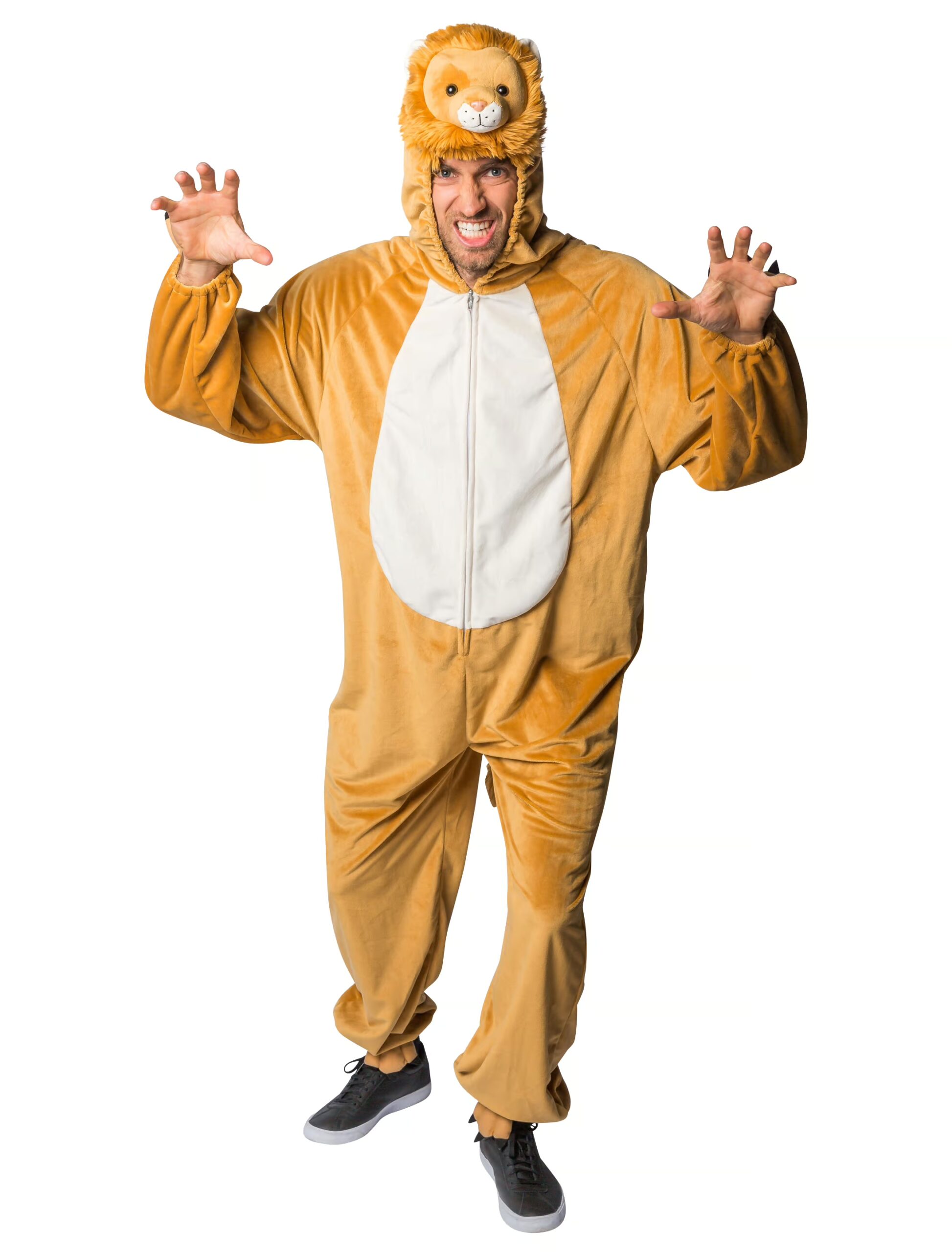 In nur wenigen Schritten verwandelst Du Dich zum königlichen Herrscher des Tierreichs! Aber Du verwandelst Dich nicht nur zum König des Tierreichs, sondern auch zum König der Herzen. Denn von Deinem kuschelig-weichen Fell kann niemand genug bekommen. Dich würde man am liebsten den ganzen Tag kraulen. Die Pfoten mit Krallen an den Fuß- und Ärmelsäumen, der Schwanz auf der Rückseite und das buschige Löwenfell sowie die Löwenöhrchen an der Kapuze runden diesen hellbraunen Löwen Overall perfekt ab. Prachtvoll und kuschelig! Mit diesem Herren Kostüm bist Du einfach zum Knuddeln! Bei so vielen Streicheleinheiten wünscht Löwe sich doch das ganze Jahr Karneval! Reinschlüpfen, Reißverschluss schließen, Kapuze aufsetzen und auf geht´s auf die nächste Karnevalsparty!