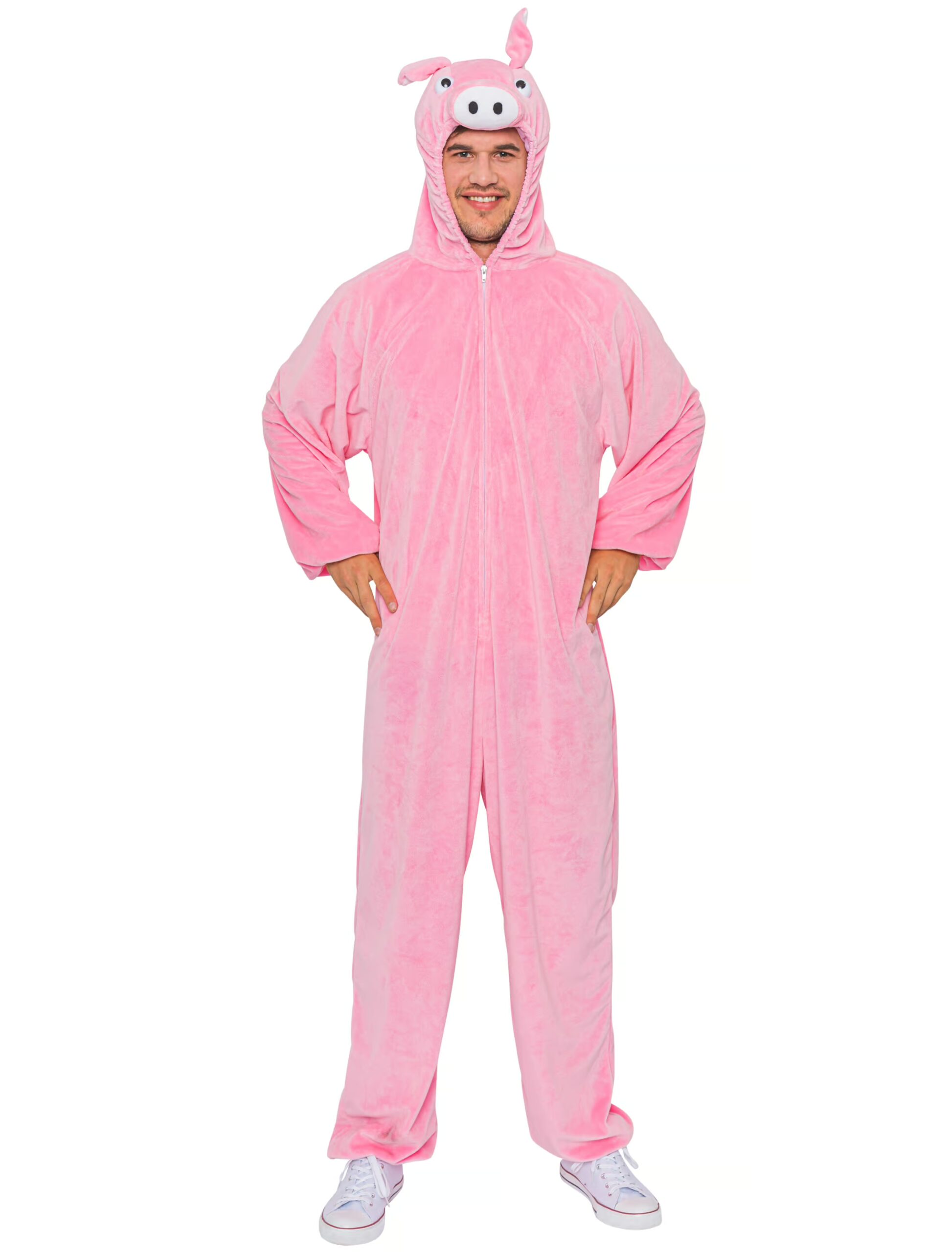 Du liebst es, Dich zu verkleiden und bist Dir für nichts zu schade? Wie wäre es, wenn Du Deine Freunde bei der nächsten Mottoparty oder in der nächsten Karnevalssession mit einem plüschigen, pinken Schweinekostüm zum Lachen bringst? Der Overall besteht aus 100% Polyester und ist so weich, dass Dich jeder knuddeln wollen wird. Optisch ist das Kostüm relativ schlicht gehalten: ein Schweinchenkopf als Kapuze mit großen Augen und der typischen Steckdosen-Nase sowie ein Kringel-Schwänzchen am Rücken. Damit Du Dich nach einem anstrengenden Karnevalsumzug und/oder einer langen Partynacht einfach aus dem Kostüm befreien kannst, befindet sich an der Front ein Reißverschluss.