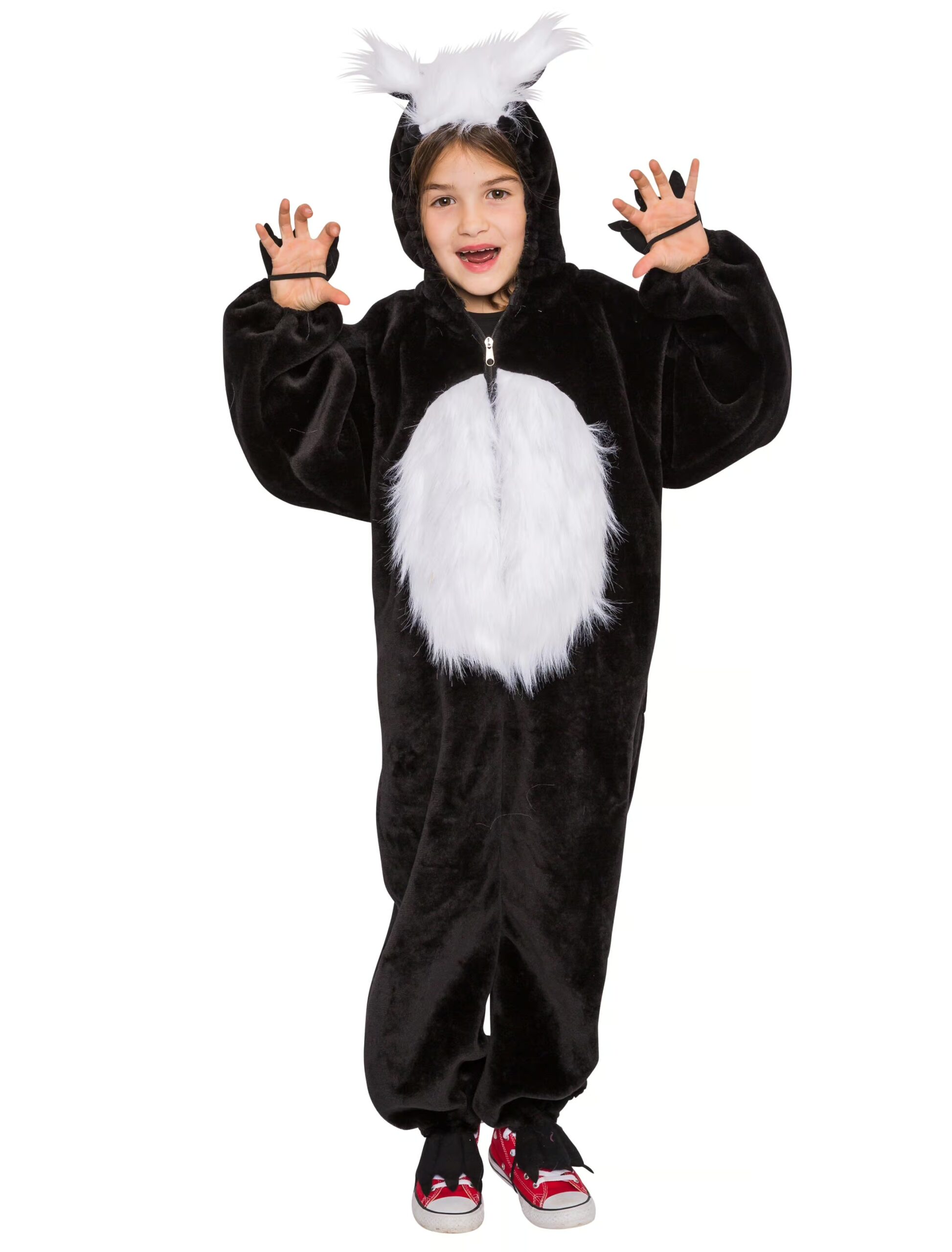 Ihr sucht nach einem Stinkktier (Skunks) Kostüm zu Karneval und Fasching für die Gruppe oder Familie? Dieser schwarz-weiße Stinktier Plüschoverall für Kinder in Größe 98 bis 128 passt doch perfekt. Die Kapuze besteht aus einem Stinktier-Kopf. Der Reißverschluss befindet sich in der Front. An der Kapuze, an den Fuß- und Ärmelenden sind Gummizüge eingenäht. Ein breiter Schwanz ist am hinteren Teil des Overalls vernäht. Die Hände und Füße sind mit Gummibändern versehen, um sie einfach umzubinden.