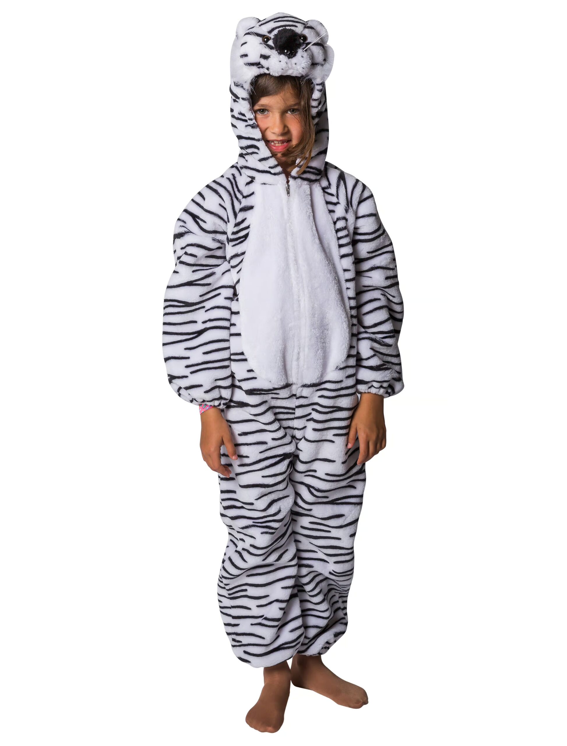 Verkleide Dich als wahrer König unter den Tieren und feiere den Straßenkarneval im warmen und kuschligen Tiger Overall in Weiß! Der Overall für Kinder in Größe 98-128 besitzt einen Tiger-Kopf als Kapuze, der mit einem Gummizug versehen ist. Mit der Hilfe eines Reißverschlusses in der Front wird der Overall verschlossen. Die Fuß- und Ärmelenden sind ebenfalls mit Gummizügen versehen und sind für die Hände und Füße mit Gummibänden ausgestattet, um sie einfach umzubinden. Ein Schwanz ist am hinteren Teil angenäht. Das Kostüm ist garantiert ein Hingucker auf der nächsten Karnevals- oder Mottoparty und macht Dich zum König unter allen Tieren!