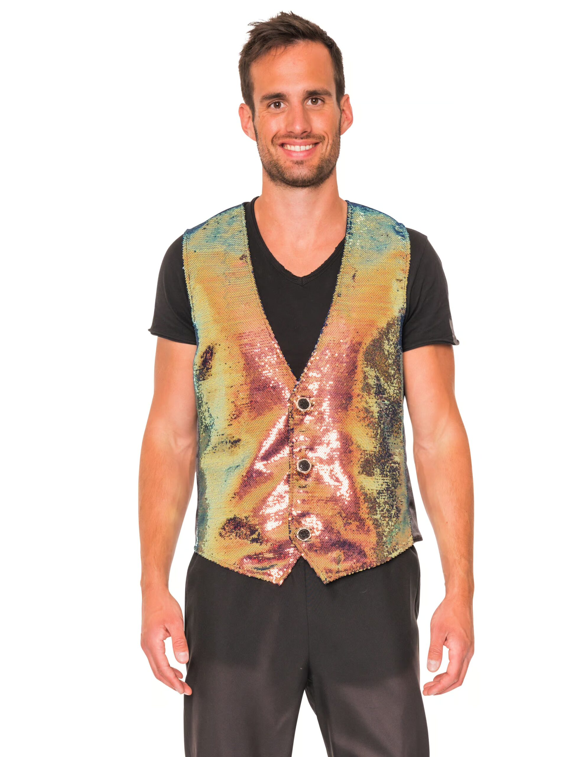Unsere glitzernde und funkelnde, kurze Paillettenweste in Gold für Herren ist ein echter Eyecatcher, der alle Blicke auf sich zieht. Sie passt zu den unterschiedlichsten glamourösen Kostümen und Party-Outfits aus unserem Shop. Die kurze, am Rücken verstellbare Herrenweste ist im Frontbereich mit schillernden, goldenen Pailletten besetzt und verfügt über eine aparte Knopfleiste mit drei Kristall-Knöpfen, der Rücken ist schwarz gehalten. Mit ihr bist Du auf Disco- oder 20er-Jahre-Mottopartys, zu Silvester und Junggesellenabschieden sowie zum Fasching und Karneval der Mittelpunkt des Interesses.