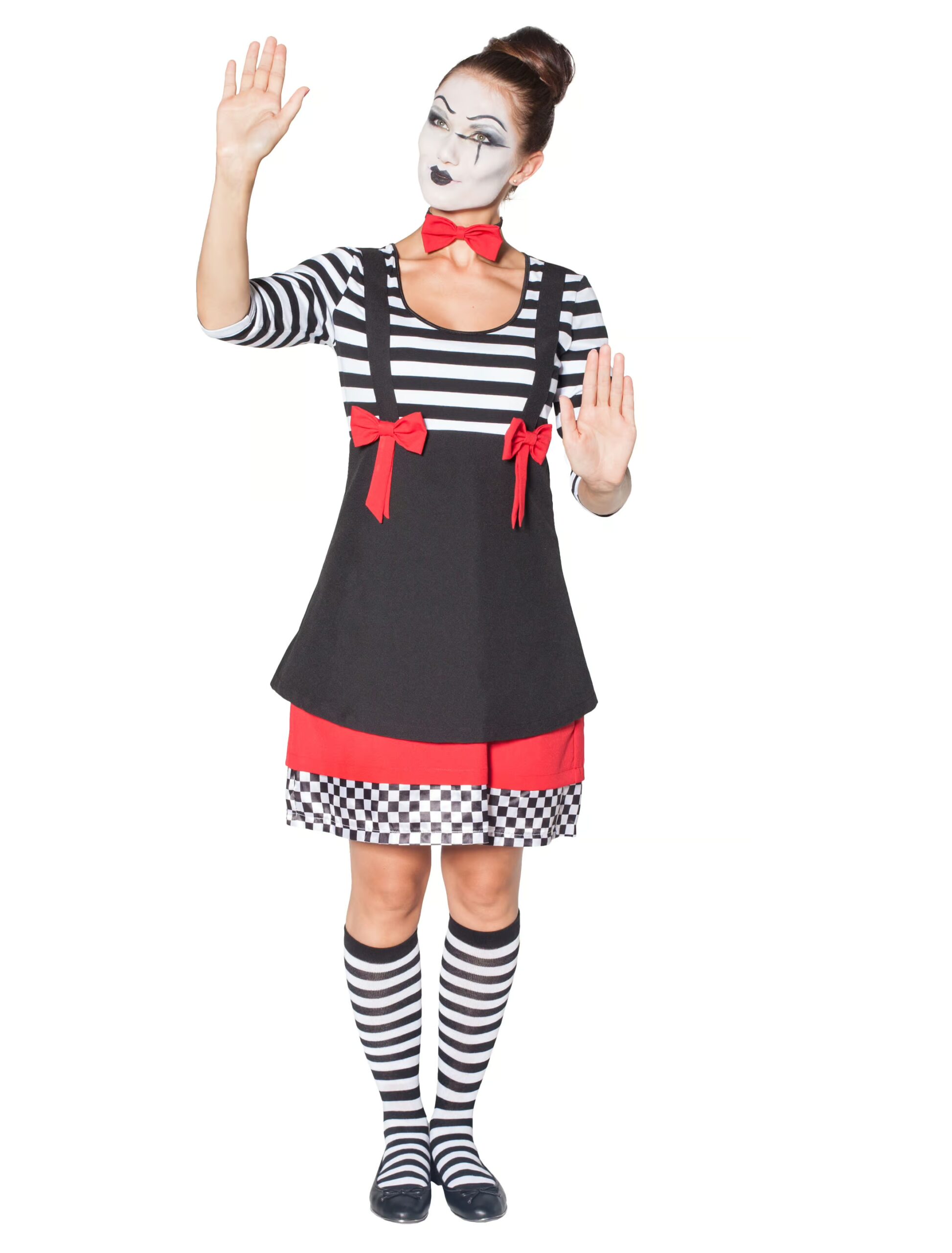 Du hast Lust auf eine ganz spezielle Herausforderung? Wie wäre es denn, nur mit Mimik und Gestik und ganz ohne Sprache zu kommunizieren? Den Grundstein für Deinen schauspielerischen Pantomime-Auftritt legst Du mit diesem ausgefallenen Damen Kostüm. Die Pantomime Frau Verkleidung besteht aus einem schicken Kleid, welches aus verschiedenen Stoffen gefertigt ist. Der obere Bereich ist schwarz-weiß gestreift. Darunter befindet sich ein schwarzer Stoff mit Hosenträgern und schicken, roten Schleifen in der Front. Der Kleiderrock ist mehrlagig und wird von einer roten sowie einer schwarz-weiß karierten Lage geziert. Der kurze Schnitt des Pantomime Kleids betont besonders Deine schönen Beine. Bei Deinem Anblick verschlägt es allen die Sprache! Ob auf der nächsten Motto- oder Karnevalsparty, mit dem extravaganten Pantomime Frau Kostüm stehst Du auch ohne Worte im Mittelpunkt! Absolute Must-Haves, mit denen Du Deinen Auftritt noch perfektionieren kannst, sind weiße Seiden-Handschuhe,