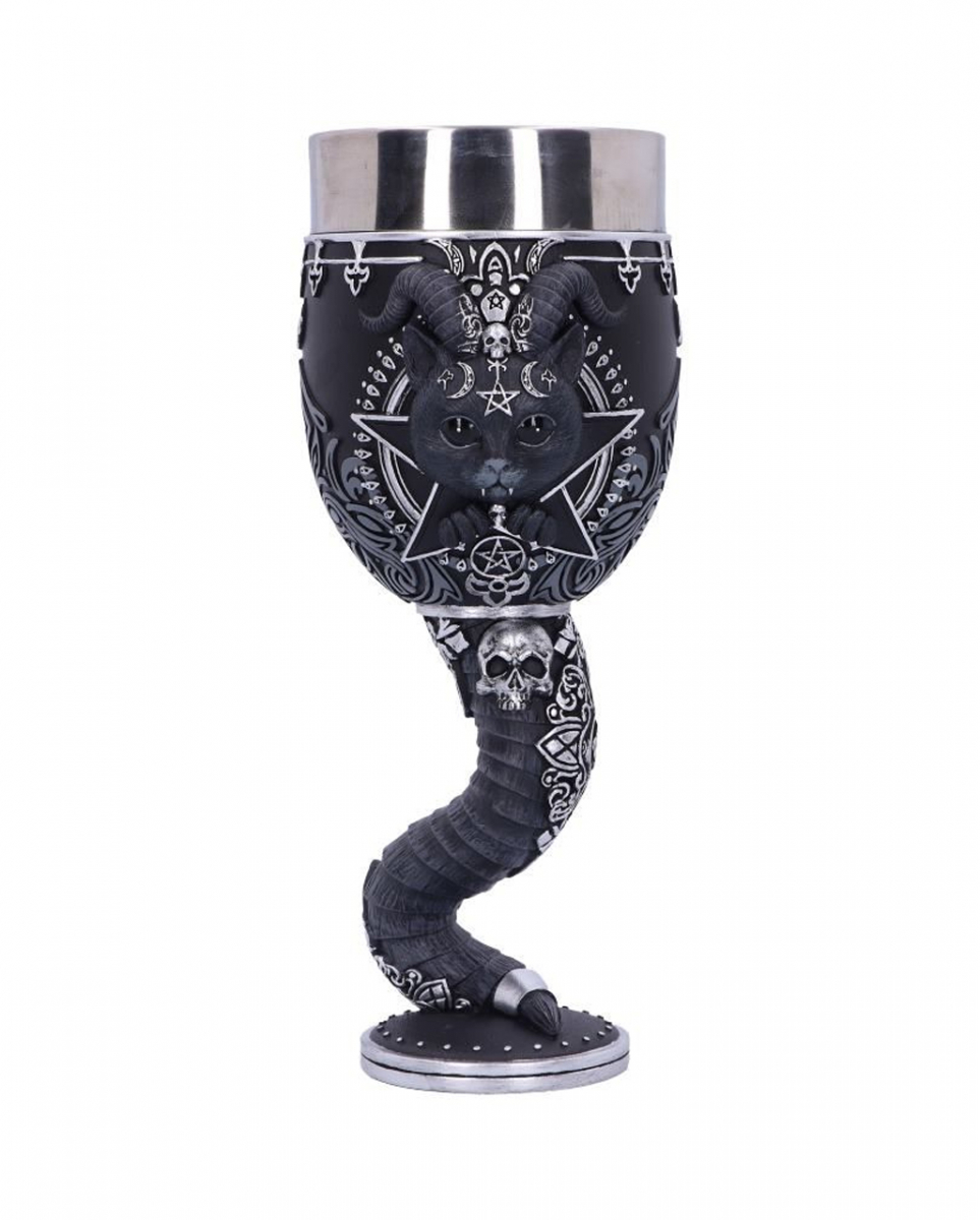 Hexenkatze mit Hörnern Kelch als Geschenkidee Hochwertiger Gothic Weinkelch mit okkulter Hexenkatze und Totenschädel Motiv Der Hexenkatze mit Hörnern Kelch als Geschenkidee ist ein edles Deko Accessoire für dein Dinner mit dem Teufel. Wollt ihr angemessen dinieren, dann greif zu und erfreue dich am okkulten Flair, das unser fantastisch gestalteter Gothic Kelch verbreitet. Die Qualität des Gothic Weinkelches ist sehr hochwertig. Unser Hexenkatze mit Hörnern Kelch ist aus feinstem Polyresin gegossen und von Hand bemalt worden. Zur einfachen Reinigung besitzt das Trinkgefäß einen entnehmbaren Edelstahleinsatz. Lieferumfang: 1 x Pawzuph Katze mit Ziegenhörnern Kelch Farbe: Schwarz, Silber Größe: ca. 19,5 cm Material: Polyresin, Edelstahl Okkulter Gothic Kelch als Tischdeko Zauberhafte Wohnungsdeko für Hexen und Magier Extra entnehmbarer Edelstahleinsatz Detailverliebt von Hand bemalt Aus feinem Kunststein gegossen Der Artikel ist kein Spielzeug. Nicht für Kinder unter 3 Jahren geeignet. Kann Kleinteile enthalten, die verschluckt werden können – Erstickungsgefahr. Von Feuer und offenen Flammen fernhalten.