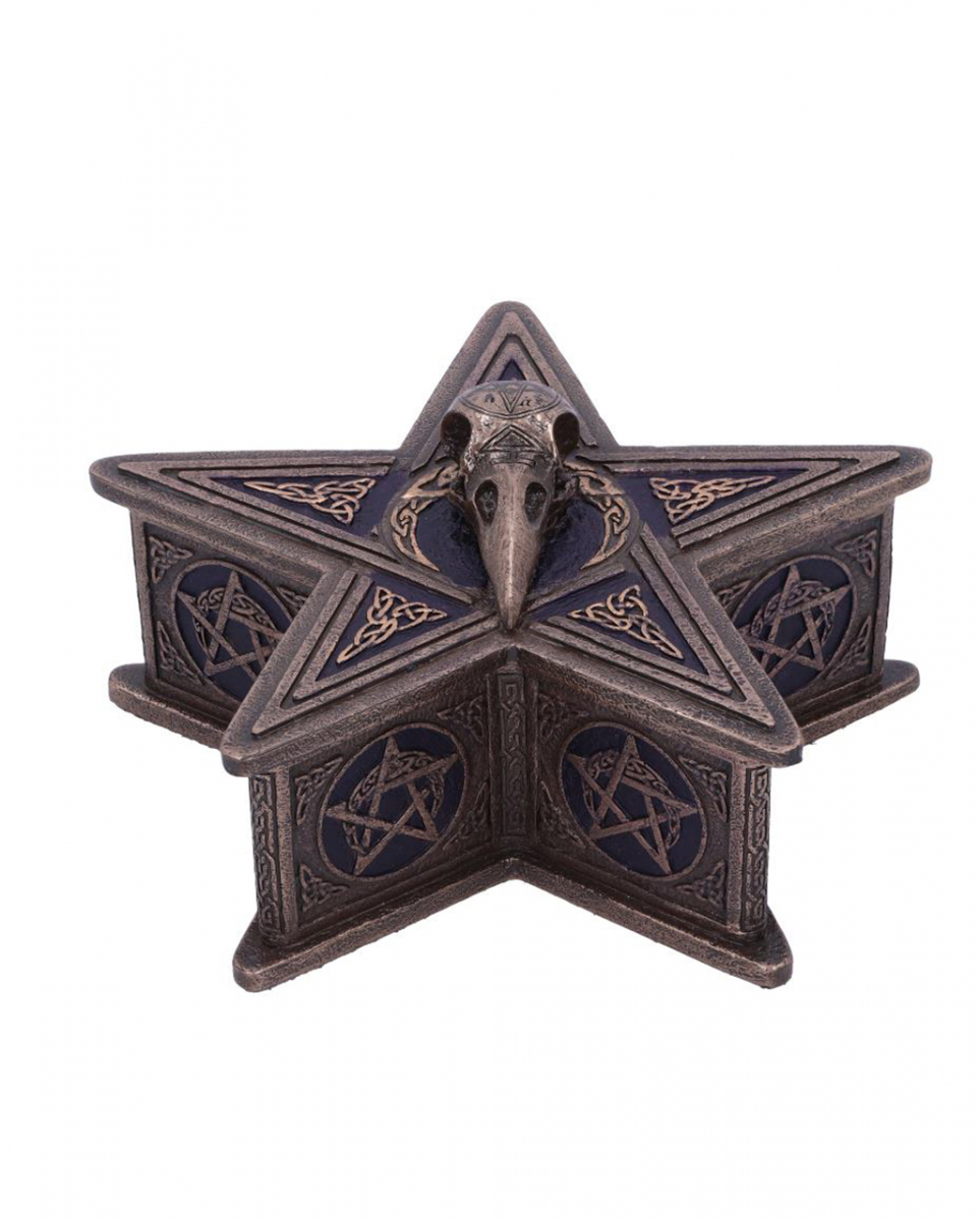Pentagramm Schmuckschatulle mit Rabenschädel 16,5cm Okkulte Box für Schmuck und Kleinkram Kostbaren Schmuck sollte man stilvoll aufbewahren. Unsere Pentagramm Schmuckschatulle mit Rabenschädel bietet das perfekte Versteck für deine Kostbarkeiten und Kleinkram. Die Gothic Schmuckdose im Pentagramm Design ist eine okkulte Aufbewahrungsmöglichkeit für Ketten, Ringe und Talismane. Die Hexen Schmuckdose besteht aus feinstem Kunststein und ist mit okkulten Symbolen designt. Lieferumfang: 1 x Pentagramm Schmuckschatulle mit Rabenschädel 16,5cm Farbe: Bronze, Violett Größe: ca. 16,5 x 15,5 x 7 cm Material: Polyresin (Kunststein) Hexen Schmuckbox mit okkultem Rabenschädel Für Schmuck und Kleinkram Mystische Pentagramme als Verzierung Handbemalte Gothic Schmuckdose Der Artikel ist ein Geschenkartikel. Nicht für Kinder unter 3 Jahren geeignet. Kann Kleinteile enthalten, die verschluckt werden können – Erstickungsgefahr. Von Feuer und offenen Flammen fernhalten.