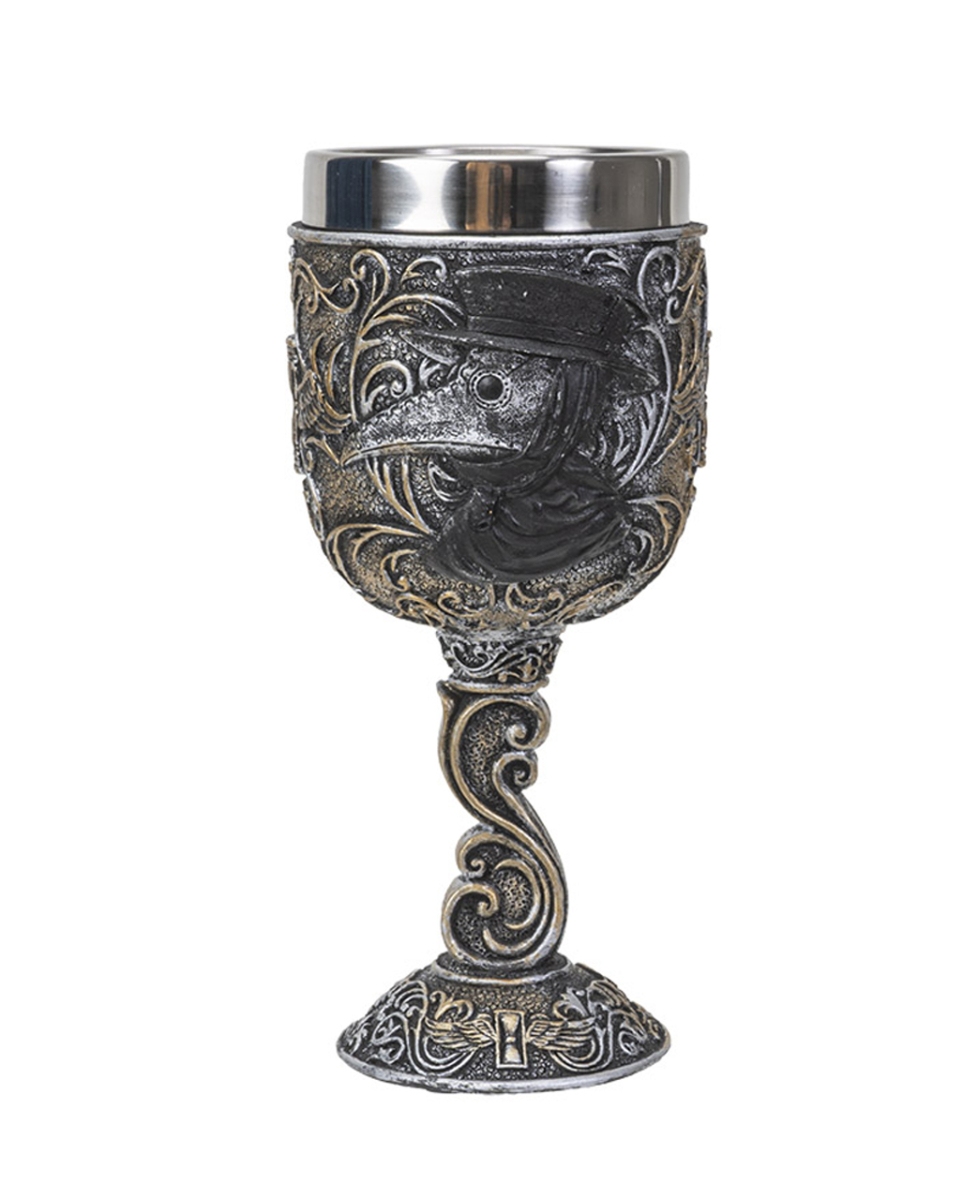 Verschnörkelter Kelch mit Pestdoktor Design 17,5cm Hochwertiger Weinkelch als Geschenkidee und Wohnaccessoire für Gothic Fans Unser verschnörkelter Kelch mit Pestdoktor Design ist ein Tor in eine Zeit, in der Tod und Mysterium zum Alltag gehörten. Neben dem Pestdoktor zeigt der Kelch eine Sanduhr mit Flügeln, ein Symbol, das dich daran erinnert, dass die Zeit nie stillsteht. Der Pestdoktor Kelch misst etwa 17,5 x 7,6 cm und ist aus hochwertigem Polyresin, kombiniert mit einem herausnehmbaren Edelstahleinsatz für einfaches Reinigen. Edle Schnörkel umranden das Motiv und machen den handbemalten Kelch zu einem echten Blickfang. Lieferumfang: 1 x Verschnörkelter Kelch mit Pestdoktor Design 17,5cm Farbe: Silber, Grau, Gold, Schwarz Größe: ca. 17,5 x 7,6 x 7,6 cm Material: Polyresin (Kunststein), Edelstahl Außergewöhnliches Trinkgefäß mit Pestdoktor Motiv Der Kelch zeigt auf beiden Seiten den Kopf eines Pestdoktors Auf den anderen Seiten eine Sanduhr mit Flügeln Der Rest des Kelchs ist mit edlen Schnörkeln verziert Zum Reinigen, herausnehmbarer Edelstahleinsatz Aus hochwertigem Polyresin gegossen Von Hand bemalt