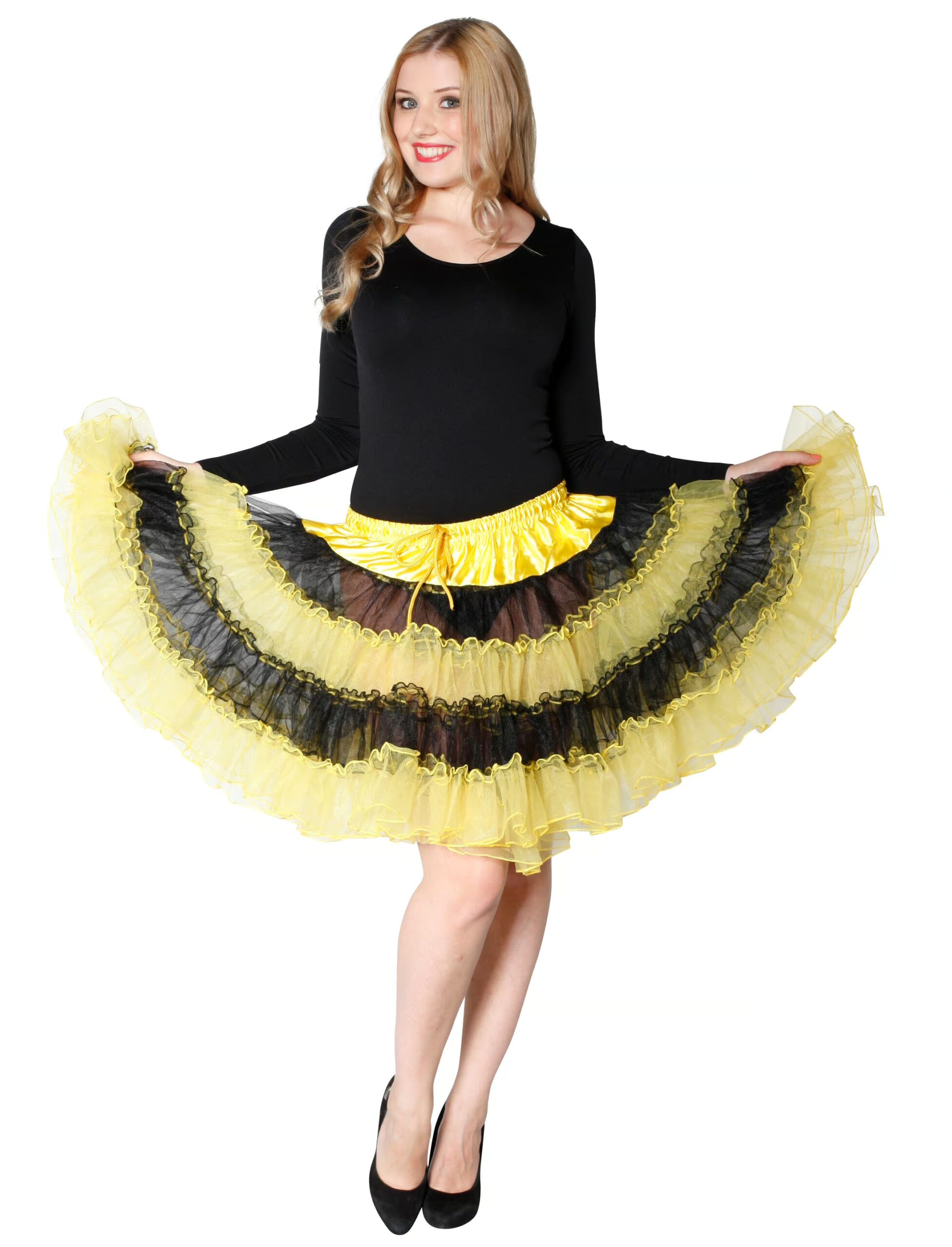 Der süße Biene Petticoat de luxe reicht bis zu den Knien und umschmeichelt durch den weit ausgestellten Schnitt perfekt Deine weiblichen Rundungen. Am Sattel ist er aus gelbem Satin-Stoff gefertigt, der mit einem eingearbeiteten Gummizug ausgestattet ist. Der Damen Rock ist unterhalb des Sattels mit horizontalen, gelb-schwarzen Streifen verziert, die sofort an das schöne Fellkleid einer Biene erinnern. Der untere Saum des Petticoats ist mit schicken, gelben Tüll veredelt. Ob auf dem Sommer- oder Winterkarneval, auf Mottopartys oder einfach nur so, mit diesem Damen Bienen Petticoat bringst Du alle zum Summen! Kombiniert mit einem schwarzen Body und einem Bienen-Haarreif steht einem tierischen Auftritt nichts mehr im Wege und schon hat man das perfekte Ausgeh-Outfit für Karneval oder eine Mottoparty!