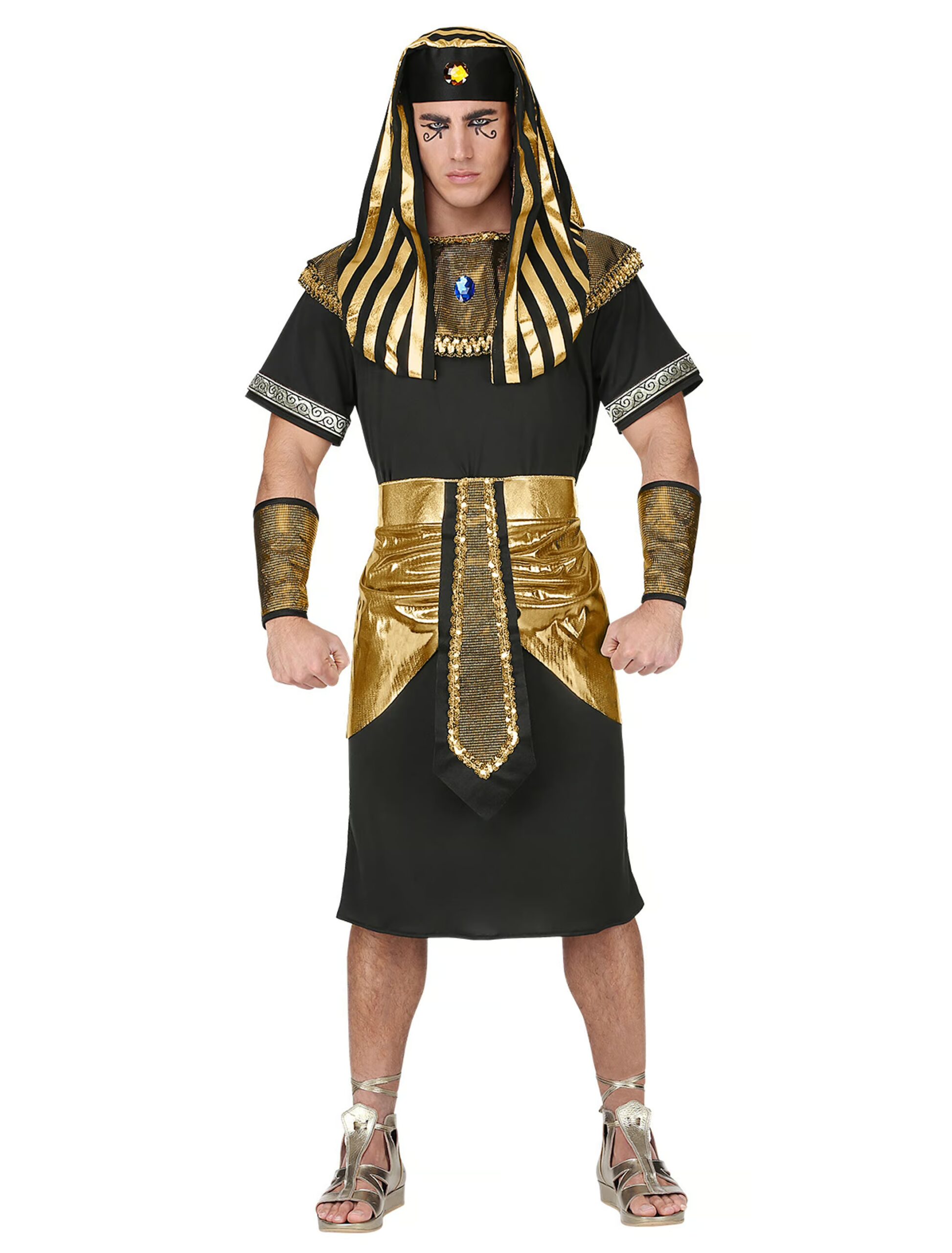 Verkleide Dich als ägyptischer Herrscher mit dem historischen Pharao Kostüm für Herren. Das königliche Outfit beinhaltet eine schwarze Tunika mit goldfarbenem Gürtel, einen Halskragen samt blau glänzendem Kunststoff-Edelstein sowie die klassische Pharaonen Kopfbedeckung. Jetzt kannst auch Du an Karneval und Fasching ein ganzes Volk regieren und Dich auf ein Treffen mit der sagenumwobenen Kleopatra freuen. Das Kostüm aus dem Land der Pyramiden macht zudem auf Mottopartys der Antike richtig was her.