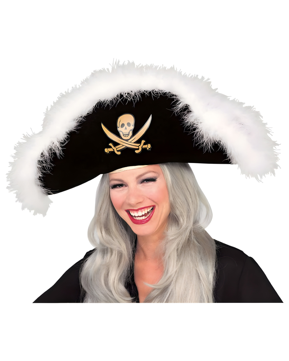 Schwarzer Piratenhut mit weißen Marabufedern  Klassischer Piratenhut als Kostümzubehör für Halloween, Fasching und Karneval Ob Captain Hook, Jack Sparrow oder Black Beard sie alle tragen mit Stolz ihren Piratenhut. Der schwarze Piratenhut mit dem goldenen Skull und Bones Aufdruck und weißen Marabufedern an der Krempe ist das schmückende Accessoire für jeden gefährlichen Piraten und die sexy Seeräuber-Braut. Lieferumfang: 1x Schwarzer Piratenhut mit weißen Marabufedern  Farbe: Weiß / Schwarz Größe: Einheitsgröße Material: 100% Polyester und Maraboufedern