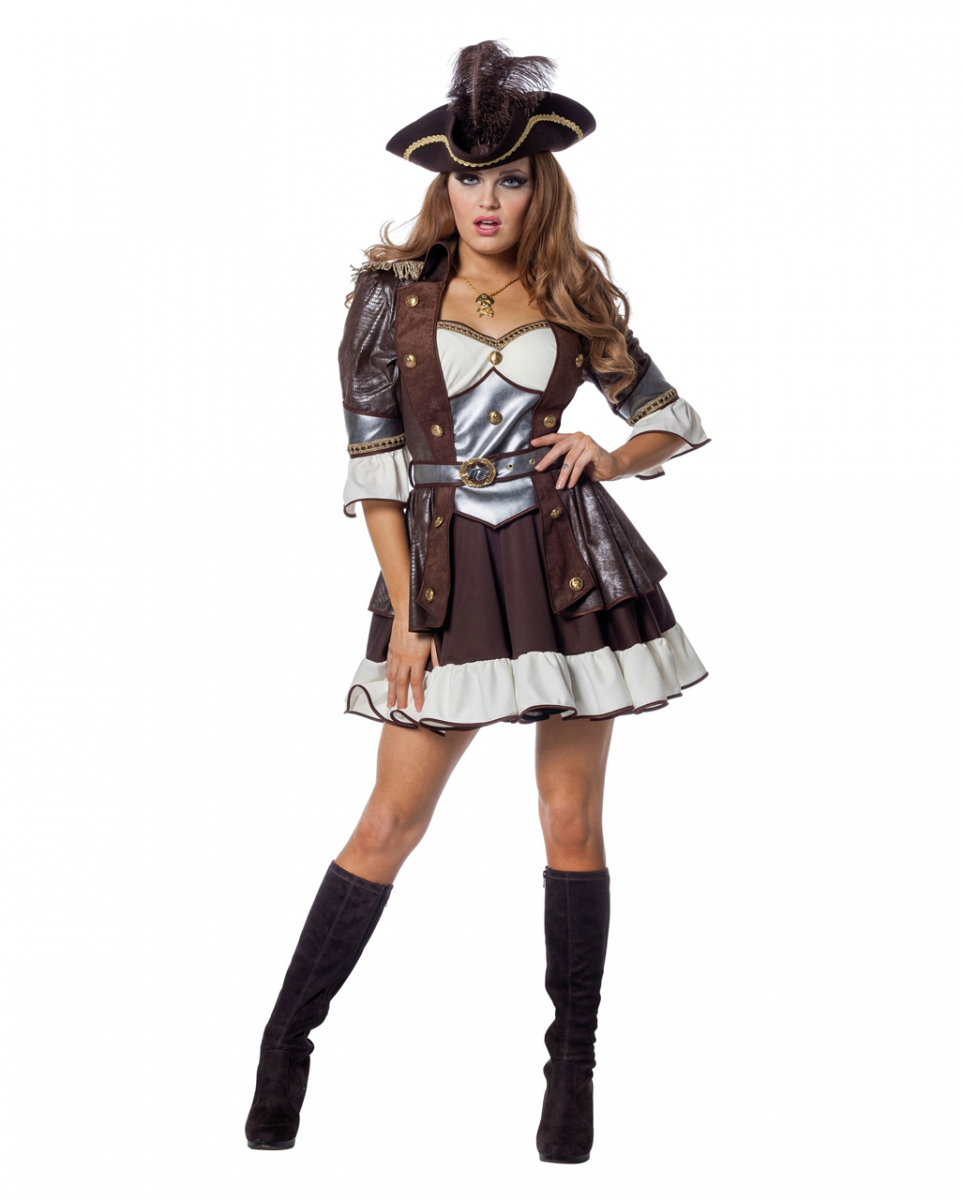 Piratenbraut Anne Damen Kostüm Premium für Fasching Entere die Motto Party als sexy Seeräuberbraut Du willst an Fasching die Party entern? Mit dem Piratenbraut Anne Damen Kostüm Premium brauchst Du nicht mal eine Waffe. Dein Auftritt ist schon scharf genug. Als wilde Anführerin der hiesigen Seeräuber-Bande wird man Dir an Karneval und Halloween ohne zu Zögern den besten Platz an der Bar frei machen. Es will sich ja an Karneval niemand mit einer echten Seeräuberbraut anlegen. Das Piratenbraut Anne Damen Kostüm Premium punktet mit vielen Details, die Dich zum Blickfang machen. Im Kleid eingenäht ist die weiße Bluse, die einen schönen und nicht zu tiefen Ausschnitt zaubert. Darüber angebracht ist die braune Weste, die mit goldfarbenen Knöpfen und Kunstleder-Applikationen verziert wurde. Mit dem dazugehörigen Gürtel kannst Du Deine Taille definieren. Lieferumfang: 1 x Piratin Anne Damen Kostüm Deluxe Inhalt: 1x Kostümkleid, 1x Gürtel Farbe: Braun/Grau/Silber/Gold Größe: 36, 38, 40, 42, 44, 46 Material: 100% Polyester Hochwertige Qualität Lässige Kunstleder Applikationen Hut, Schmuck und Schuhe nicht enthalten! Der Artikel ist ein Kostümzubehör für Erwachsene und kein Spielzeug. Nicht für Kinder unter 3 Jahren geeignet. Kann Kleinteile enthalten, die verschluckt werden können – Erstickungsgefahr. Von Feuer und offenen Flammen fernhalten.