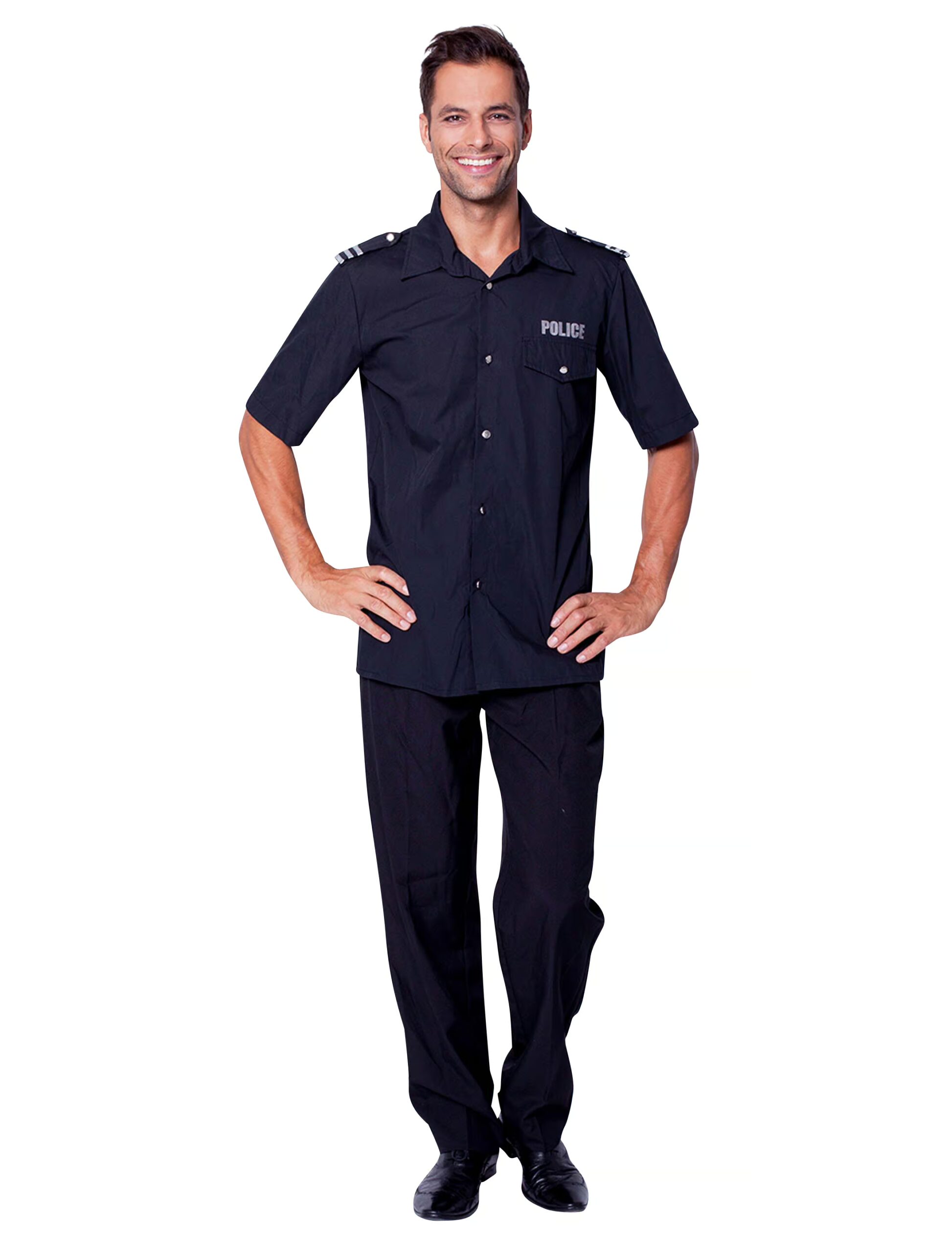 Das elegante und doch attraktive Outfit lässt Dich nicht nur seriös sondern auch verdammt gut aussehen. Das zweiteilige Herrenkostüm besteht aus einer schwarzen locker geschnittenen Hose, die durch einen Reißverschluss und einen Knopf zu öffnen und schließen ist. Sie sitzt bequem und schmeichelt Deiner Figur und verleiht Dir den echten Cop-Look! Das schwarze Hemd mit kurzen Ärmeln und schickem Kragen ist im Brustbereich mit einer silbernen Knopfleiste zu öffnen. Schulterklappen mit silbernen Knöpfen und silbernen Stickereien setzen einen weiteren Akzent bei diesem coolen Outfit. Zudem ist eine Taschenklappe mit silbernem Knopf im linken Brustbereich angenäht. Oberhalb dieser Taschenklappe befindet sich ein ‘Police’-Emblem, sowie im rechten Brustbereich ein silbernes Polizei-Wappen. Damit wirkt die Uniform originalgetreu und weist Dich als echten ‘Officer’ aus. Mit einigen Zubehörteilen wird das Kostüm perfekt und Du kannst im Stil eines echten amerikanischen Polizisten die