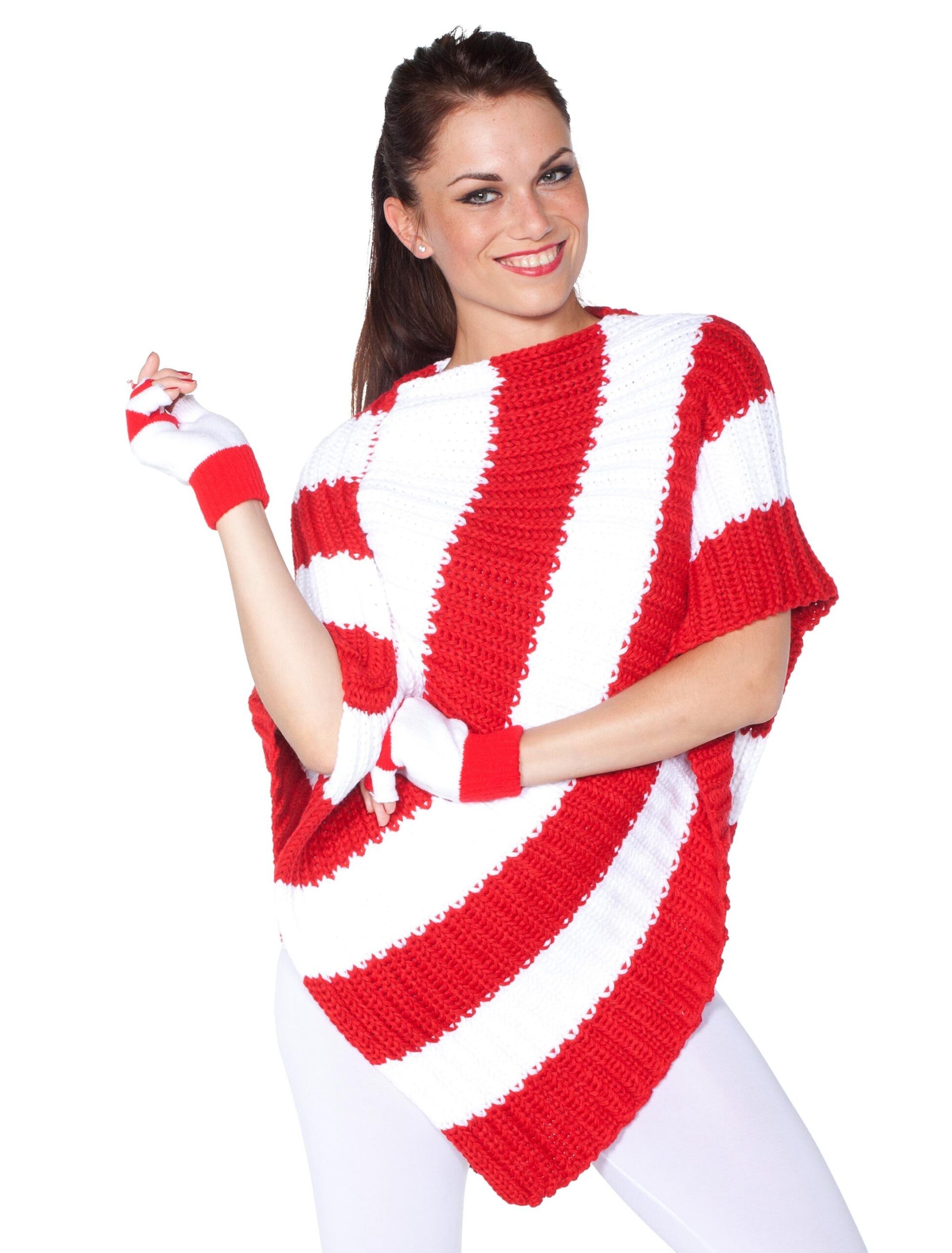 Dieser Poncho hält Dich auf Deinem Straßenkarneval garantiert schön warm und sieht zudem super schick aus! In den klassischen Kölner Farben Rot und Weiß bist Du als echtes kölsche Mädchen kuschelig und stylisch gekleidet! Der Poncho verfügt über kurze Ärmel bis zu den Ellbogen und verläuft in den unteren Säumen spitz zu und schmeichelt deiner Figur optimal. Er ist aus dickem Strick gefertigt und mit rot weißen breiten Streifen gemustert, die kölsches Flair vermitteln! Dieser Poncho ist der ideale Begleiter auf den Straßen von Köln und kleidet Dich schick in Strick!