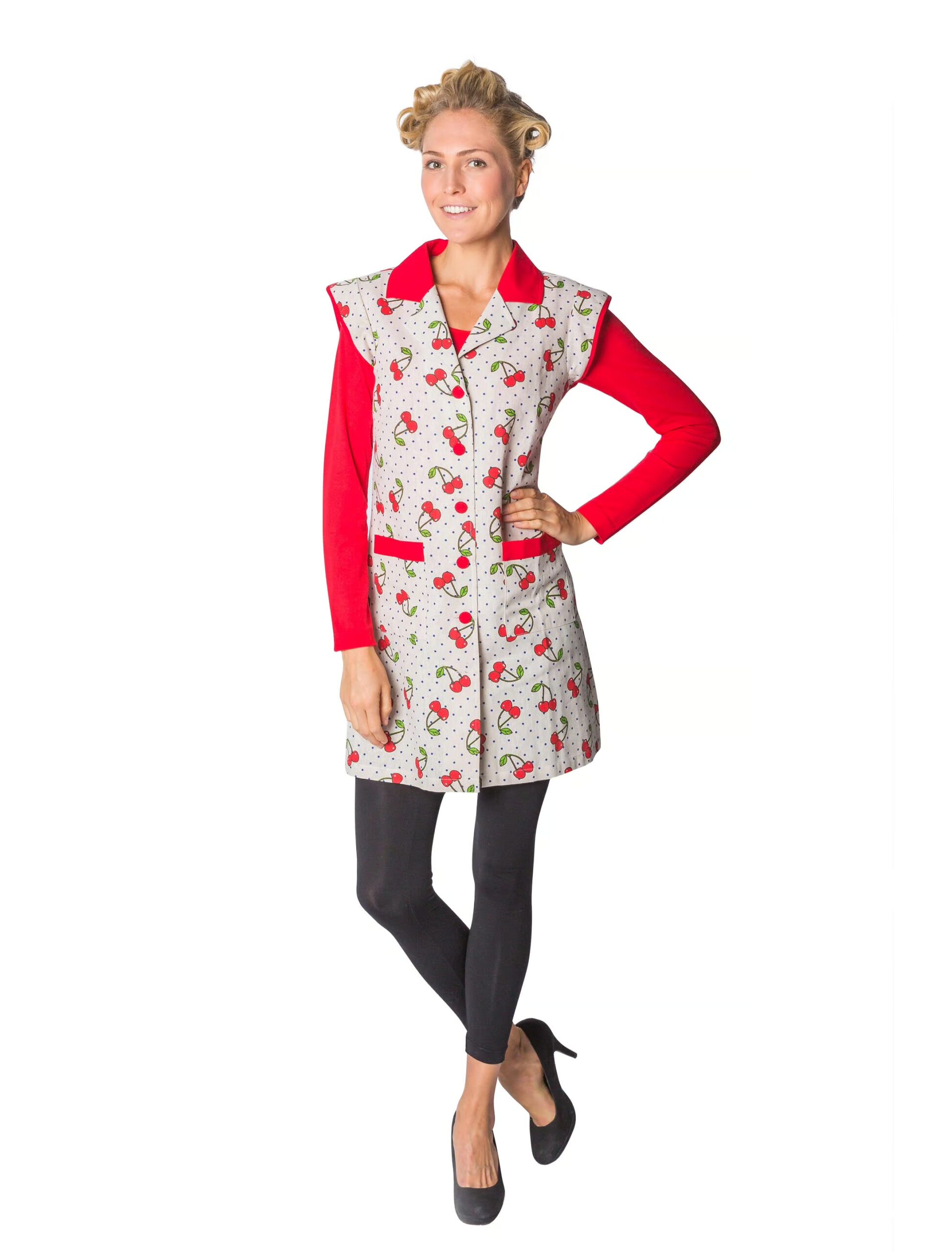 Dieser hübsche Putzkittel hat es auf die Karnevals- und Mottopartys geschafft! Kein Wunder, denn der kurze, weiße Kittel sieht dank seiner femininen Form und den vielen schwarzen Punkten und knallroten Kirschen richtig trendy aus. Die roten Eingriffstaschen in der Front, der rote Stehkragen und die kurzen Ärmel runden den Kirschen Putzkittel perfekt ab. In der Front lässt er sich bequem schließen oder auch offen tragen. Dazu passen perfekt Leggings und ein Haarband. Ein toller Hingucker, mit dem auch das Putzen im eigenen Zuhause gleich doppelt Spaß macht!