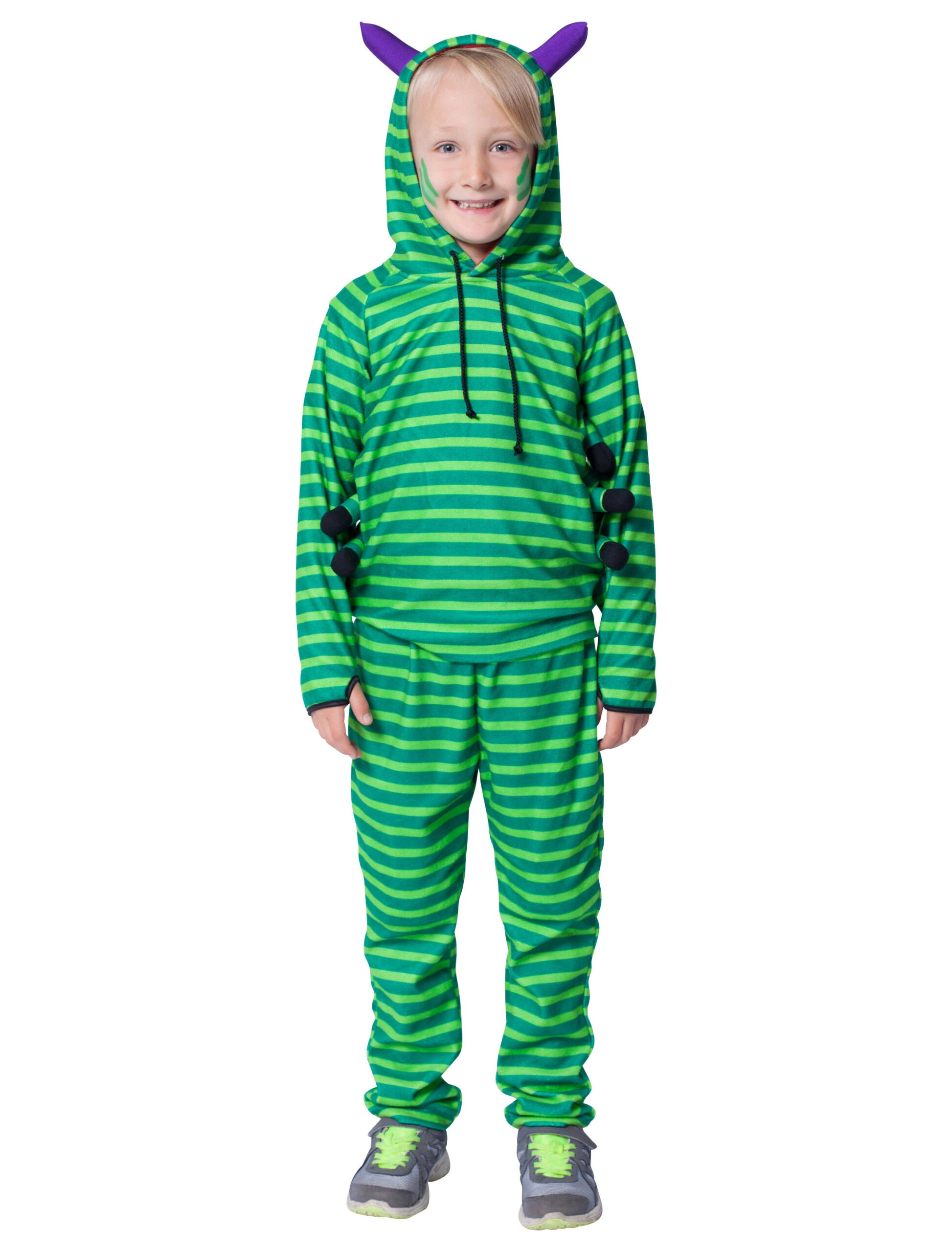 Mit dem zweiteiligen Raupen Kostüm für Kinder braucht es keinen schönen Schmetterling – so süß ist diese kleine Tierverkleidung für den Karnevalsnachwuchs. Das grüne Raupen Outfit für Faschingsfeten und Tier Mottopartys besteht aus einem geringelten Oberteil mit tierischen Gliedmaßen und Kapuze samt lilafarbenen Fühlern und der dazu passenden Hose. Die einzigartige Verkleidung des liebenswerten Pflanzenfressers ist das perfekte Geschenk für kleine Kostümfans und einen unvergesslichen Kindergeburtstag.
