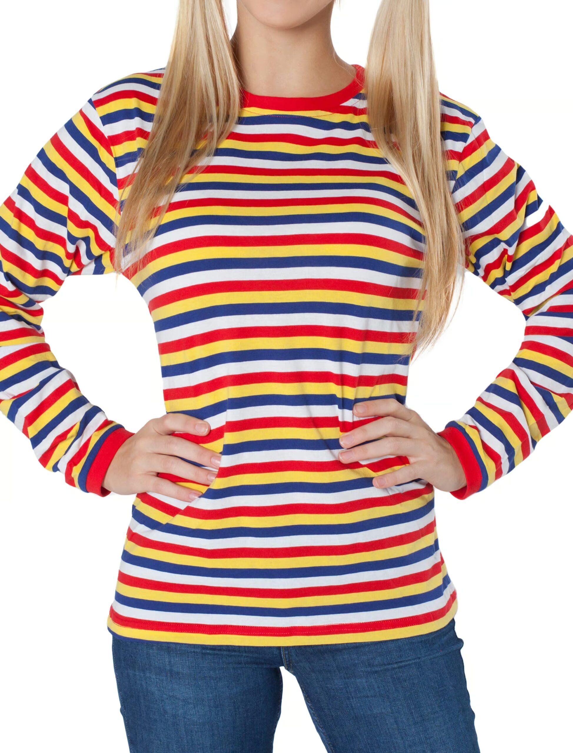 Mit unserem langärmligen Ringelpulli in den Farben Rot, Weiß, Blau und Gelb bringt Dein Kind ordentlich Farbe ins Spiel! Das bunt gestreifte Shirt lässt sich mit allen Farben kombinieren und ist die ideale Ergänzung für Dein Karnevals-Outfit. Perfekt für Mädchen oder Jungen Clowns und alle anderen Jecken!