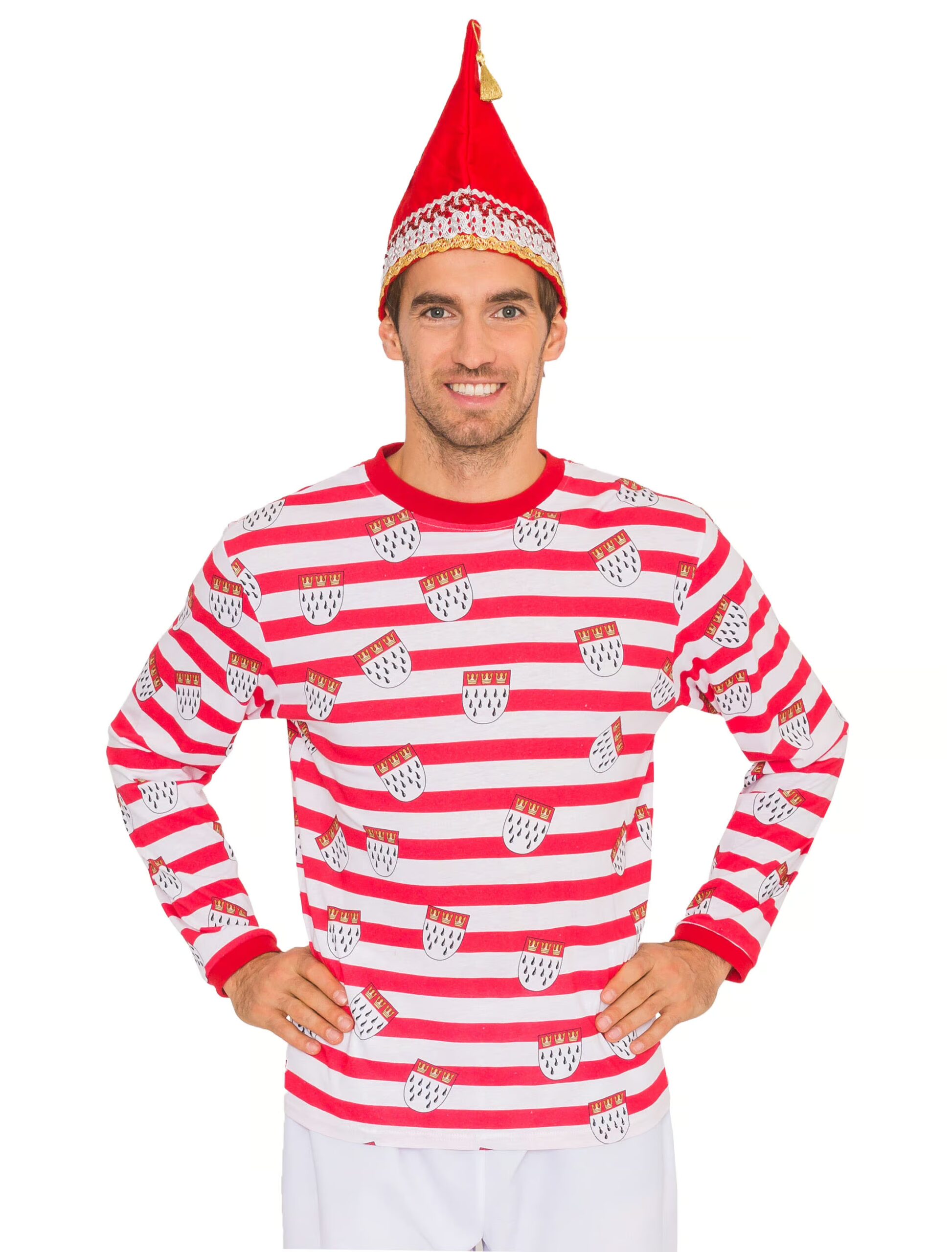 Du bist auf der Suche nach einem passenden Oberteil für Dein kölsches Outfit? Unser langärmliger Köln Ringelpulli darf hier nicht fehlen. Der rot-weiß geringelte Langarmpulli ist komplett mit Köln Wappen bedruckt. Ein schönes Kostümteil zum Karneval in Köln. Der Pullover ist aus 100% Baumwolle gefertigt. Das Produkt beinhaltet nur einen langärmligen Pulli.