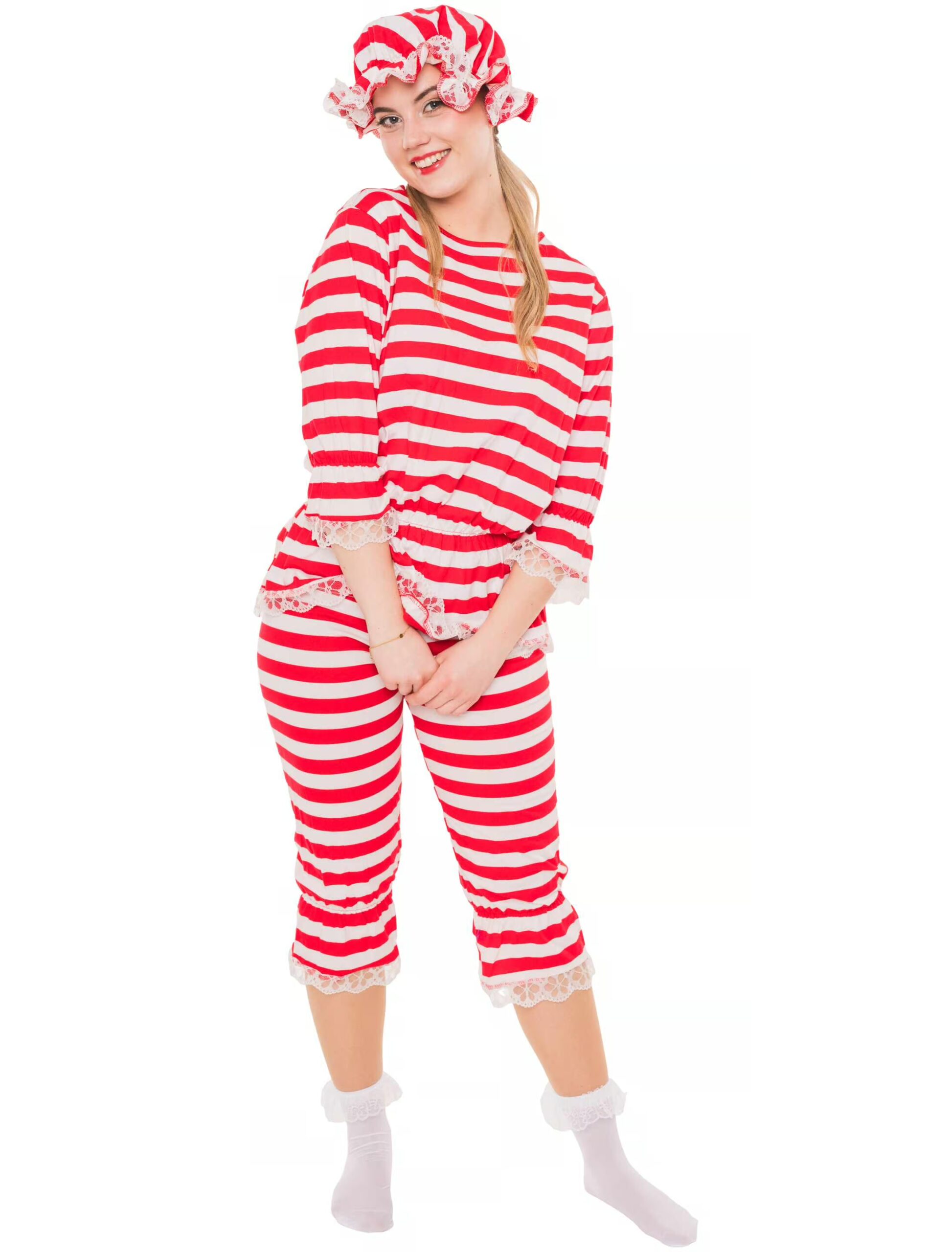 Ringelshirt und Hose mit Spitze 2-tlg. weiß/rot S/M, ideal für Karneval & Fasching