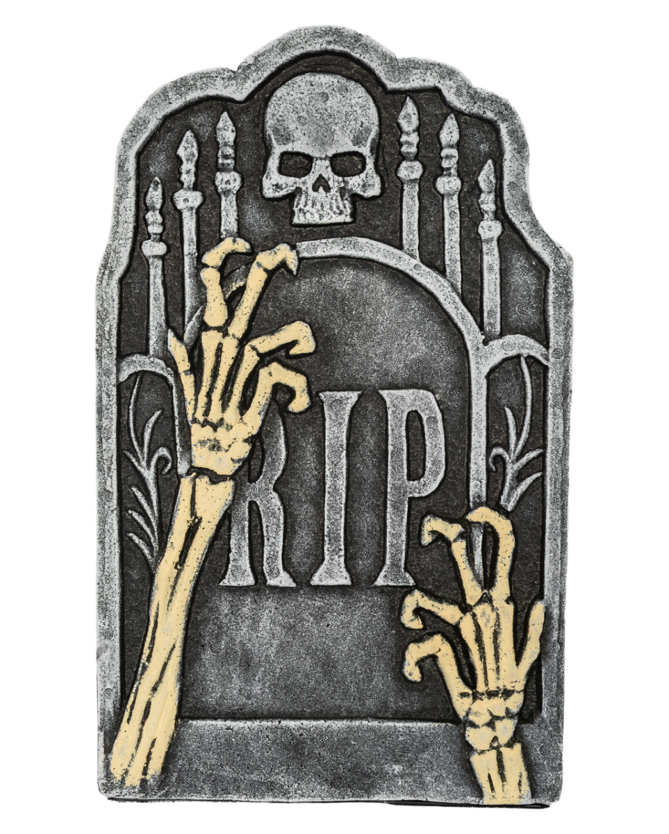 Grabstein mit Skelett Händen und RIP Aufschrift 55cm Deko Kunststoff Grabstein mit Totenkopf Entscheide dich für eine Halloween Gartndeko, die für Staunen sorgt! Der Grabstein mit Skelett Händen und RIP Aufschrift ist ein Mahnmal an jeden, der deinen Garten passiert. Perfekte Gruseldeko für den Vorgarten! Der RIP Deko-Grabstein für Halloween ist mit Skelett-Händen und verwitterten Details verziert. Er misst stolze 55cm und besteht aus robustem Kunststoff, was ihn ideal als Halloween Außendekoration macht. Lieferumfang: 1 x Grabstein mit Skelett Händen und RIP Aufschrift 55cm Farbe: Grau, Beige Größe: ca. 55 x 34 x 2,5 cm Gewicht: 300 g Material: Polystyrol, Kunststoff Modriger Halloween Grabstein als Gartendekoration Knochenhände, die aus dem Grab ragen, RIP Inschrift und Totenschädel Geniale Garten Friedhofsdeko für Halloween Inkl. 2 Erdspieße aus Kunststoff als Halterung für weiche Erde Ideal für Innen- und Außendekoration