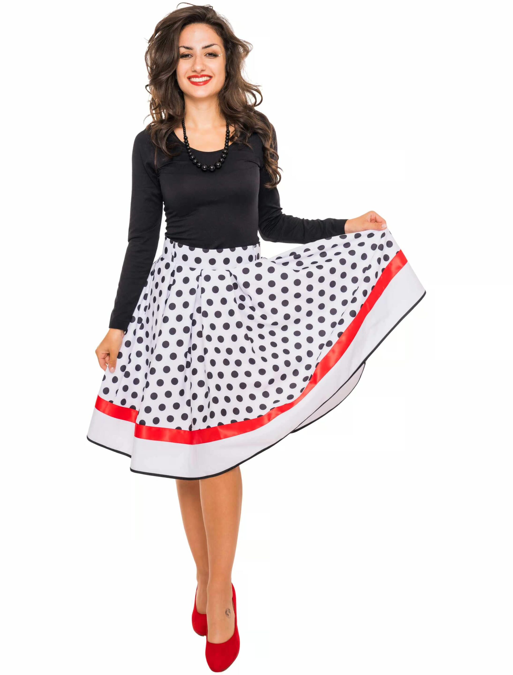 Mit unserem gepunkteten Rock katapultierst du dich direkt zurück in die wilden 50er! Die Ära der Milkshakes, Jukeboxen und Petticoats hat nicht nur Elvis gerockt – jetzt bist du dran. Der schwingende Schnitt sorgt dafür, dass du bei jeder Bewegung aussiehst wie frisch aus einem Tanzfilm gehüpft. Ob Rock’n’Roll-Party, Mottoabend oder einfach ein bisschen Retro-Feeling für den Alltag – dieser Rock ist dein perfekter Partner. Die frechen Polka-Dots bringen Spaß und Schwung in deinen Look, während die Länge dafür sorgt, dass du elegant, aber trotzdem tanzbereit bleibst. Kombiniere ihn mit einem süßen Top, einer schicken Schleife im Haar und ein bisschen Rockabella-Attitüde – und schon bist du die Queen der Tanzfläche. Punktlandung garantiert!