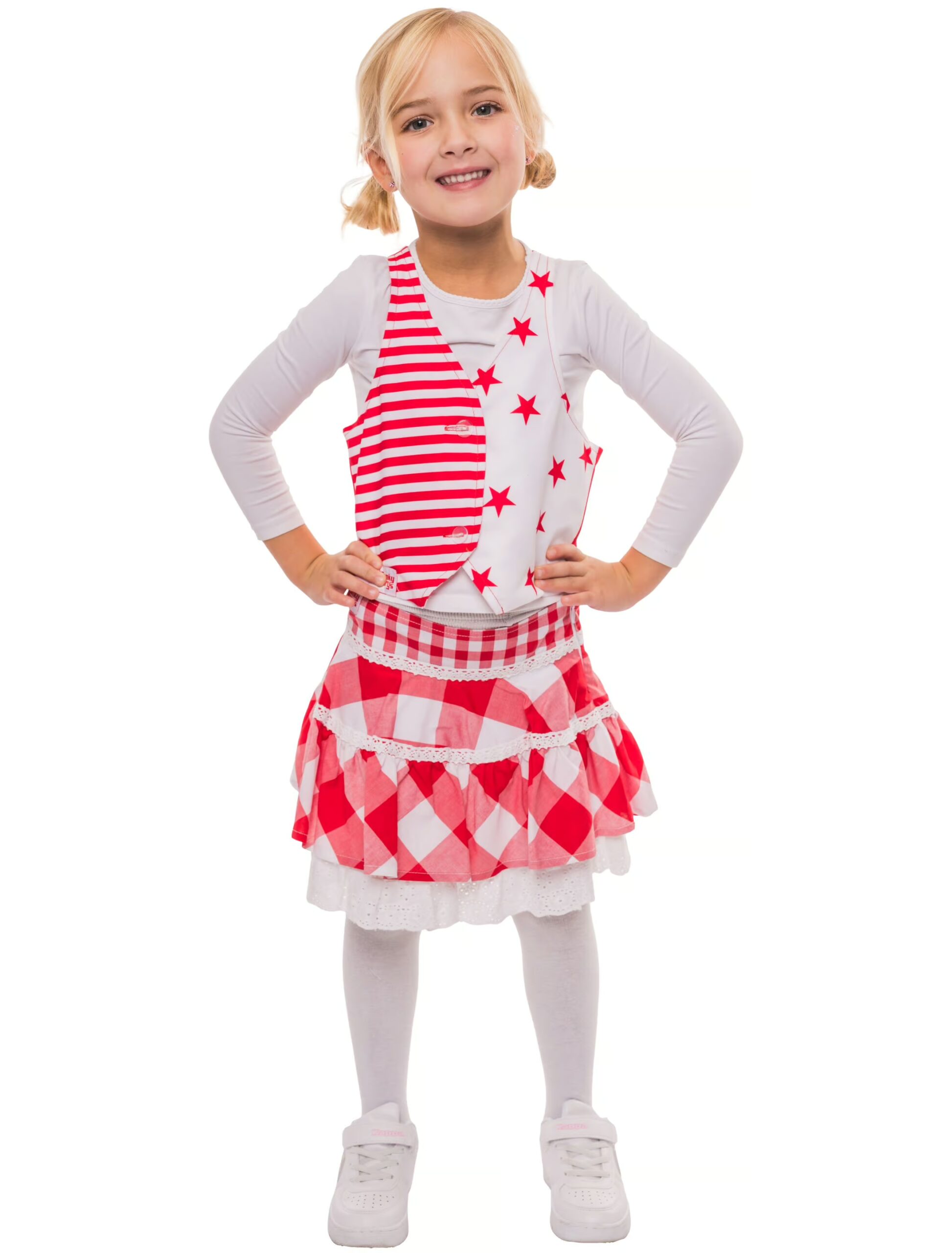Dieser Funky Marys Rock für Kinder ist ideal für die jecke Karnevalszeit! Der zweilagige Rock mit rot-weißen Karomustern ist mit zwei gestickten Borten geziert. Mit einem Reißverschluss auf der linken Seite kann der Rock einfach an- und wieder ausgezogen werden. Der Bund ist an der rechten Seite mit dem originalen Funky Marys-Logo versehen. Fehlt nur noch das passende Shirt sowie die Weste und die weißen Beinstulpen mit Strumpfhose.