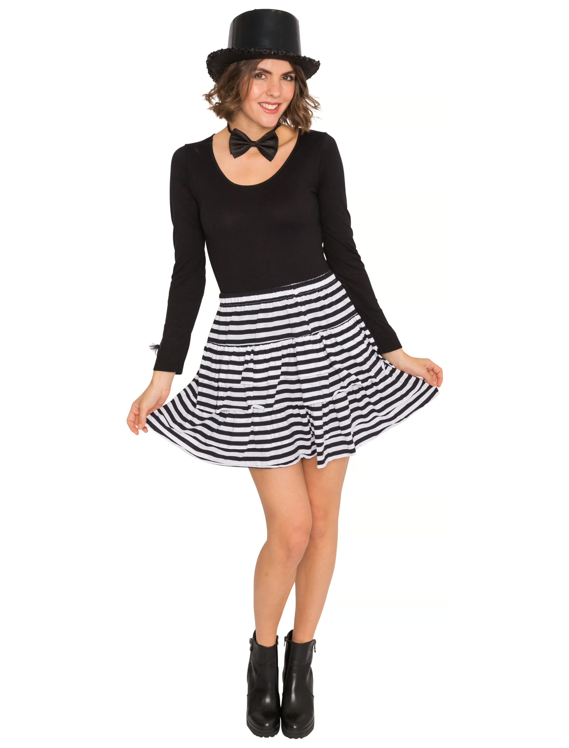 Dieser süße Rock ist an Karneval oder auf Deiner Mottparty garantiert Dein idealer Begleiter. In den Farben Schwarz und Weiß bist Du als Pantomime oder als Clown perfekt und schick gekleidet. Der Rock ist am Bund mit einem Gummibund ausgestattet und kann so bequem den ganzen Tag oder Abend getragen werden. Er reicht bis zu den Knien und ist mit schwarz-weißen Querstreifen gemustert. Ca. zwei Lagen Rüschen machen den Rock zum absoluten Hingucker. Feier in diesem bequemen und schicken Rock Deine Karnevalsparty und kombiniere ihn zu Deiner Kostümidee, ganz nach Deinen Belieben. Dieser Rock ist für jede Tanzeinlage zu haben!