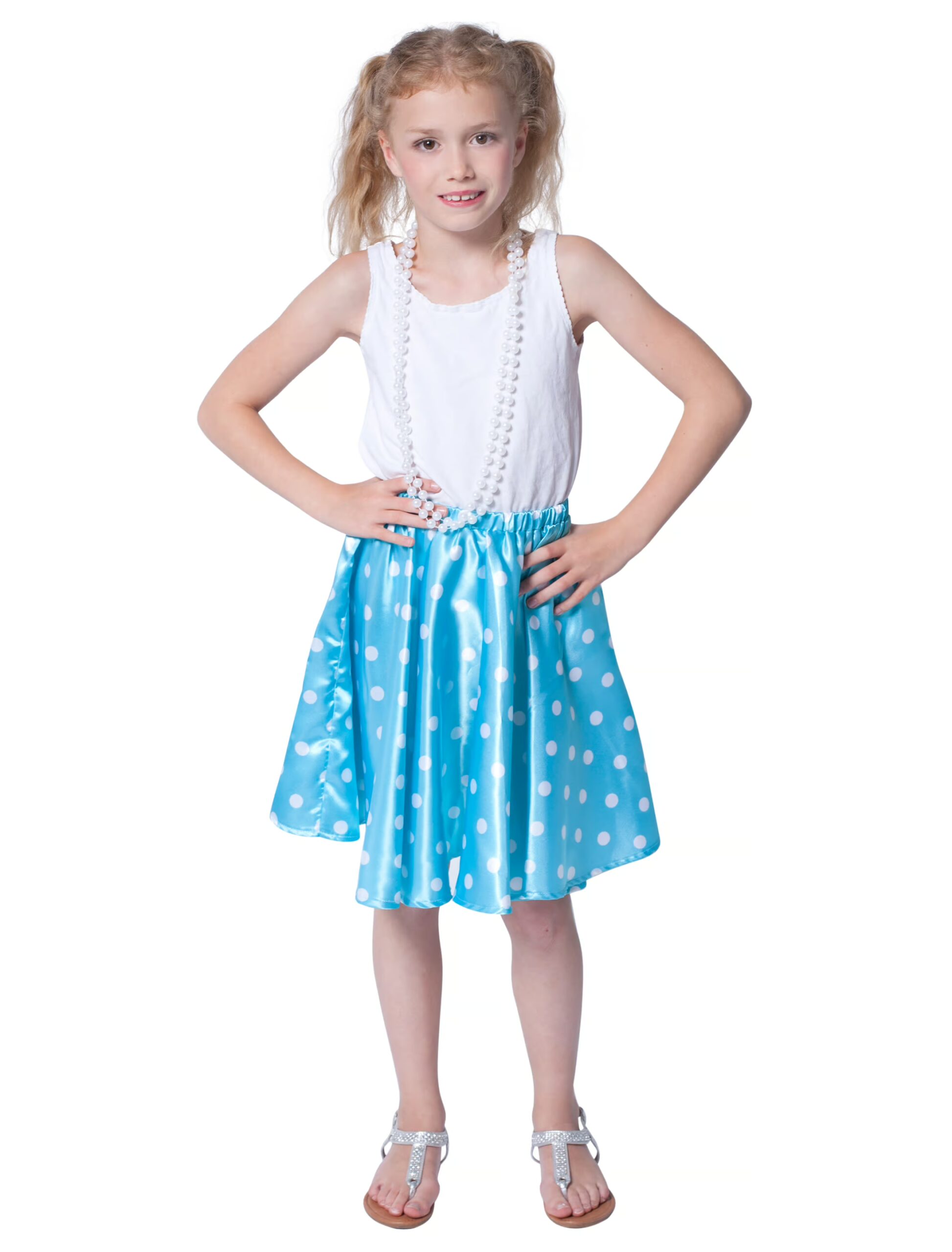 Mit diesem schicken Rock für Mädchen rockst Du garantiert Deine Kostümparty wie kein Zweiter! Lasse den Rock n Roll aufleben und die Hüften schwingen, denn dieser Rock schwingt garantiert mit! Der türkise elegante Rock, ist aus Stoff in Satin-Optik gefertigt und mit dem klassischen weißen Punktemuster versehen. Mithilfe eines elastischen Bundes ist er bequem zu tragen und passt sich jeder Figur optimal an. Kombiniert mit einem Haarband und buntem Perlenschmuck, steht Deinem Auftritt als Rock n Roll Girl nichts mehr im Wege!