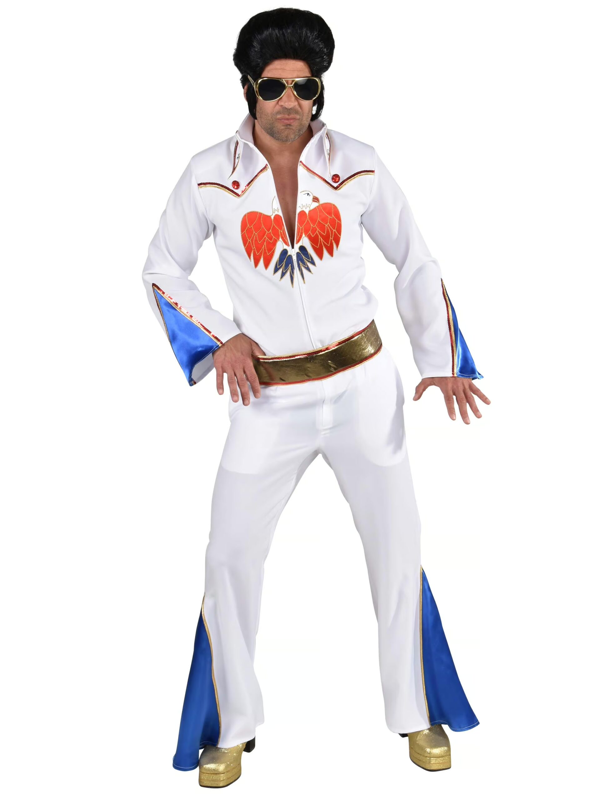 A little less Conversation, a little more Action, please! Mit unserem schicken Rockstar Deluxe Kostüm für Herren kannst Du jede Menge Action auf der Karnevalsbühne erleben. Gleich drei unterschiedliche Teile bekommst Du für das Rockabilly Outfit zur Verfügung gestellt. Das Outfit setzt sich aus einer Jacke, einer Hose und einem Gürtel zusammen. Geziert wird die Brust des Oberteils mit einem schicken Adler. Zudem ist das Kostüm mit Schlagärmeln und -hosenbeinen ausgestattet. Dazu passt die klassische schwarze Rockabilly Perücke und eine Piloten Sonnenbrille, die Du ebenfalls bei uns ergattern kannst.