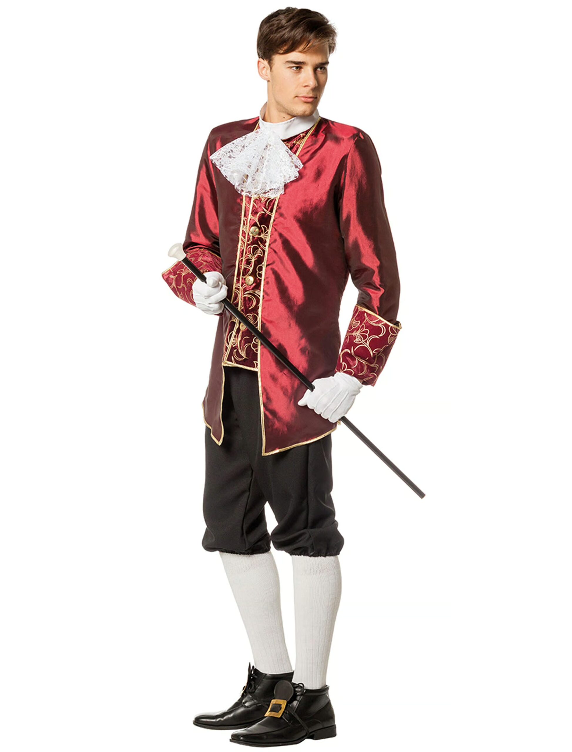 In diesem Kostüm hättest Du als feiner Edelmann die frühen französischen Zeiten sicherlich gut durchleben können… Unser Rokoko Herrenkostüm ist zweiteilig, bestehend aus einer Kniebundhose und einer Jacke. Die Hose ist aus einem einfachen schwarzen Stoff gefertigt und verfügt über einen elastischen Hosenbund. Die Jacke ist aus weinrotem Satin hergestellt. Die breiten Ärmelumschläge sowie die Front sind mit weinrot farbenem Samt abgesetzt, welcher zusätzlich mit einem edlen gold farbenen Muster verziert ist. Zusätzlich wird sie Front von einem feinen Jabot, welches aus weißer Spitze gefertigt ist, geziert. Das Material des Kostüms besteht zu 100% aus Polyester.
