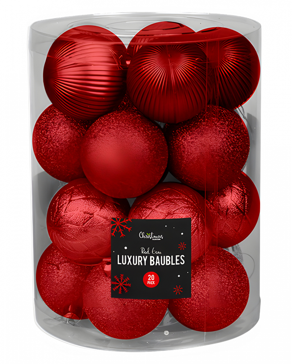 20 rote Weihnachtskugeln aus Kunststoff für den Christbaum Bruchsichere Baumkugeln in 3 verschiedenen Designs Verzaubere deinen Weihnachtsbaum mit unseren leuchtend roten Weihnachtskugeln! Diese atemberaubenden Christbaumkugeln sind ein wahrer Blickfang und bringen eine festliche Atmosphäre in dein Zuhause. Unsere roten Weihnachtskugeln kommen im praktischen Set mit 20 Stück zu dir nach Hause. Jede Kugel hat einen Durchmesser von ca. 6 cm und besteht aus Kunststoff, der bruchsicher ist. So kannst du sicher sein, dass deine Dekoration auch den wildesten Weihnachtsfeiern standhält. Die Kugeln sind in drei verschiedenen Designs erhältlich, teilweise mit Glitzer verziert, um ihnen einen noch glamouröseren Look zu verleihen. Lieferumfang: 1 x 20 rote Weihnachtskugeln aus Kunststoff für den Christbaum Inhalt: 20 Stück Farbe: Rot Größe: ca. 6 cm Material: Kunststoff Bruchsichere Baumkugeln 3 verschiedene Designs Teilweise mit Glitzer geziert
